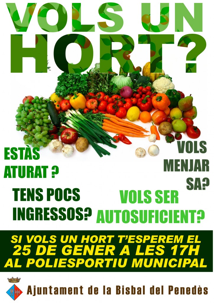 Ocupació Vols un Hort? admin 14/01/2014 Vols un Hort? SI VOLS UN HORT T’ESPEREM EL 25 DE GENER A LES 17H AL POLIESPORTIU MUNICIPAL