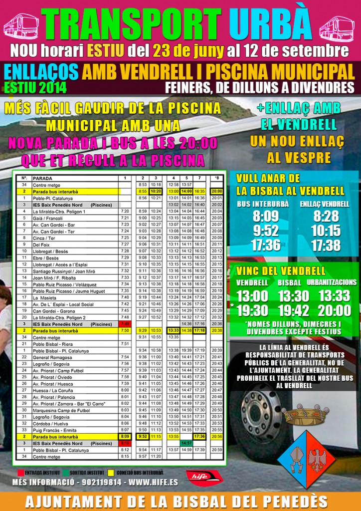informació Notícies Horari Transport estiu 2014 admin 19/06/2014 A partir del 24 de juny es modifique com cada any les parades del Bus per adequar-les a la temporada d’estiu. S’inclou la parada de la piscina pública i els enllaços amb el Vendrell
