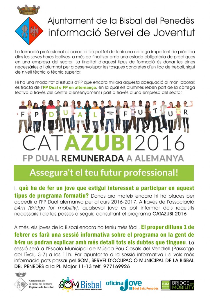 La Regidoria de Joventut us informa de la FP Dual Remunerada a Alemanya per al curs 2016-2017, a través de l’associació b4m i l’Oficina Jove del Baix Penedès.