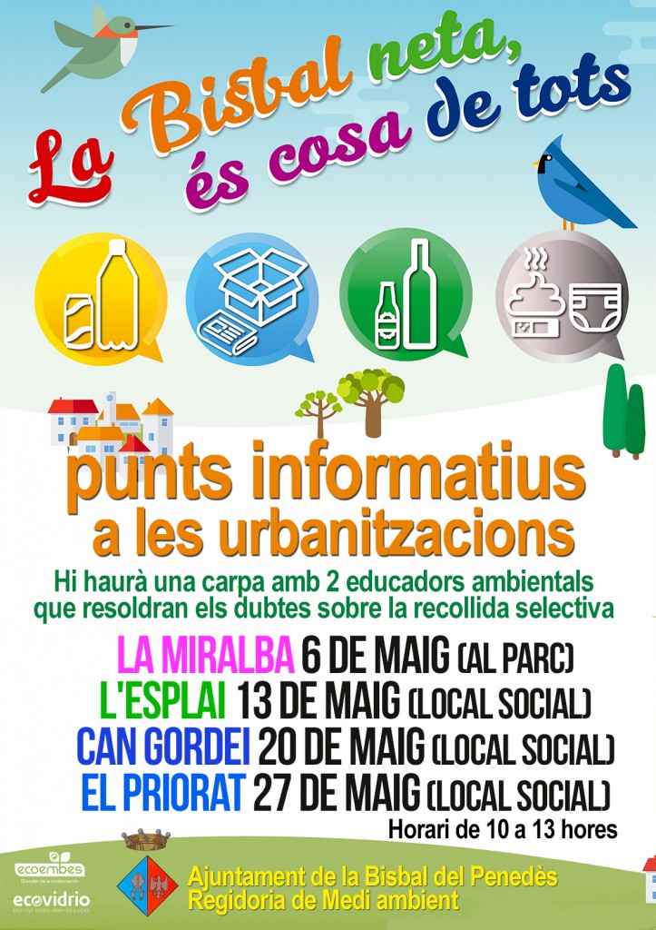 La Regidoria de Medi Ambient de l’Ajuntament de La Bisbal del Penedès engega una campanya informativa amb la finalitat de conscienciar la ciutadania sobre la importància de la recollida selectiva i el reciclatge en algunes urbanitzacions del municipi. Tots els dissabtes del mes de maig es duran a terme accions informatives en una carpa ubicada als punts que s’indiquen a continuació: