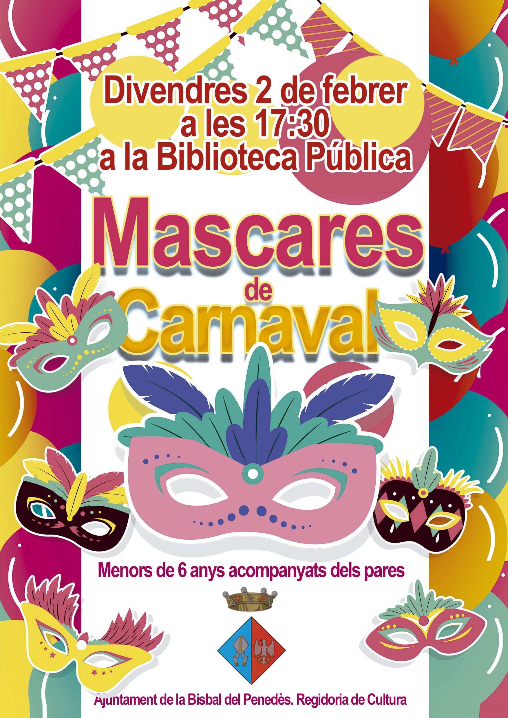 Aquest divendres 2 de febrer a les 17.30h t’esperem a la Biblioteca Pública de la Bisbal per fer màscares de carnaval! No hi faltis, ens ho passarem pipa!