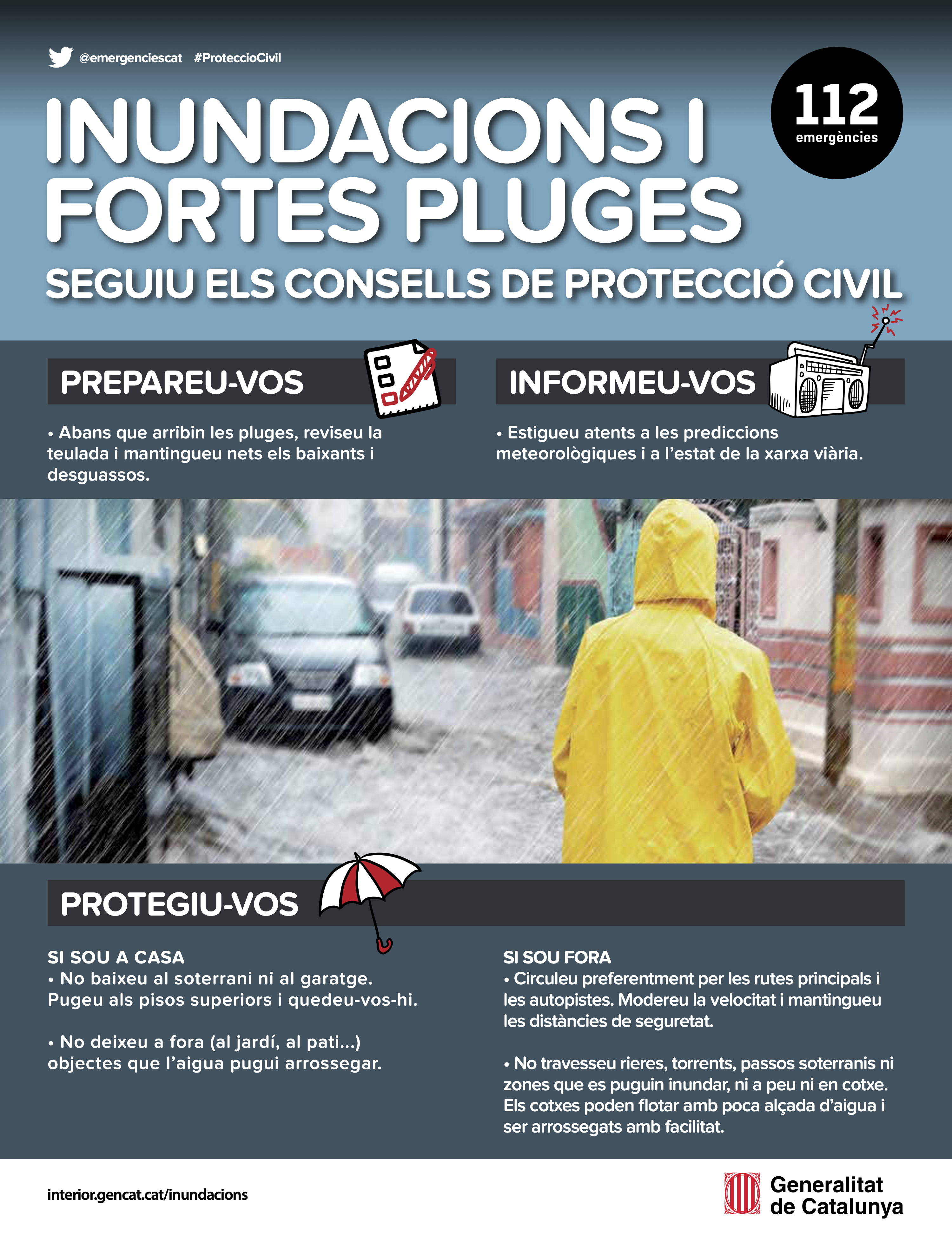 El Servei Meteorològic de Catalunya ha emès avisos per intensitat de pluja per avui dimecres a la tarda/nit i la matinada de dijous. Extremeu les precaucions i seguiu les recomanacions de Protecció Civil.