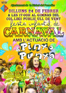 -Lunes 24 de febrero, a las 17:00h, en el gimnasio de la Escuela Ull de Vent, fiesta infantil de Carnaval con la actuación de Pinxo & Punxa y merienda (sin gluten). Organiza la Concejalía de Fiestas.