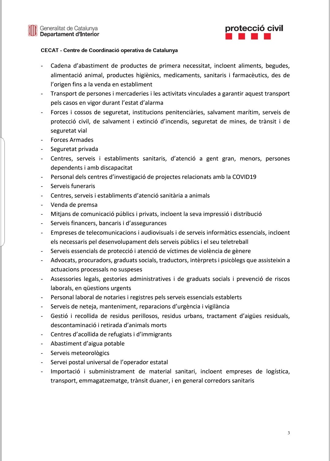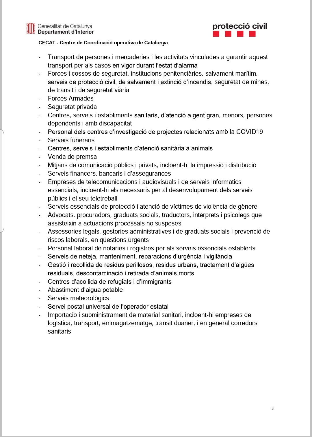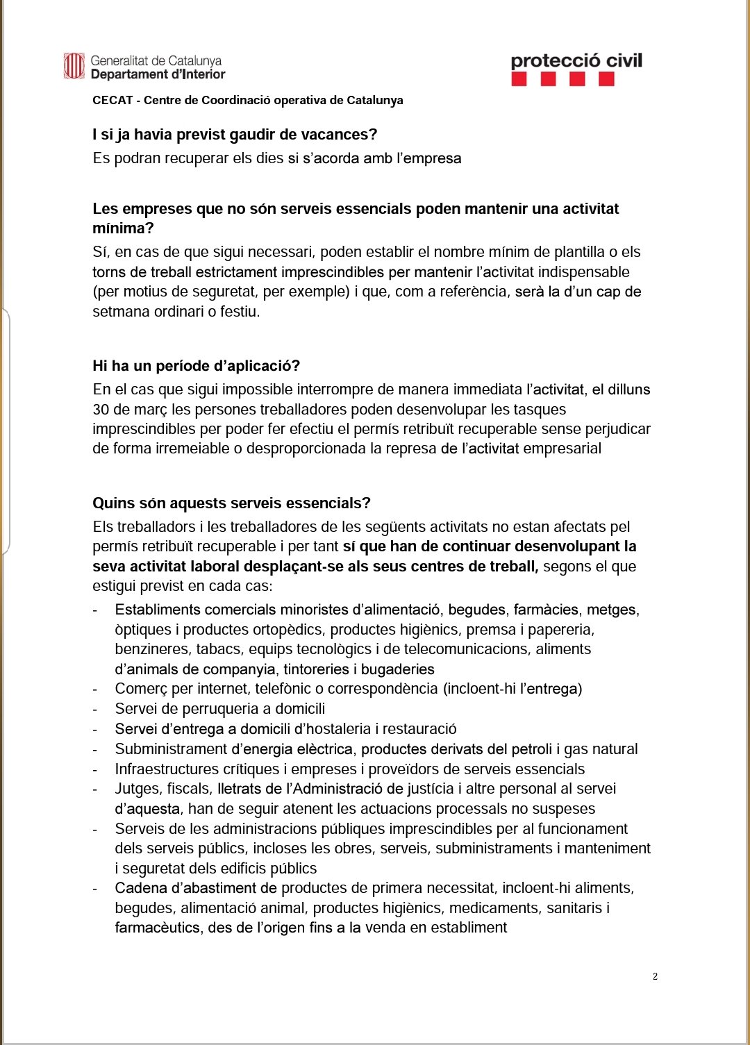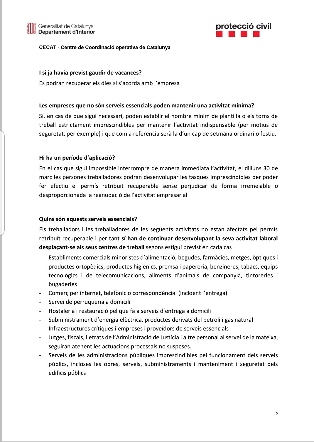 Aquest és el document que ha elaborat Protecció Civil amb preguntes i respostes sobre els serveis essencials que han de continuar treballant a partir d’avui dilluns 30 de març.