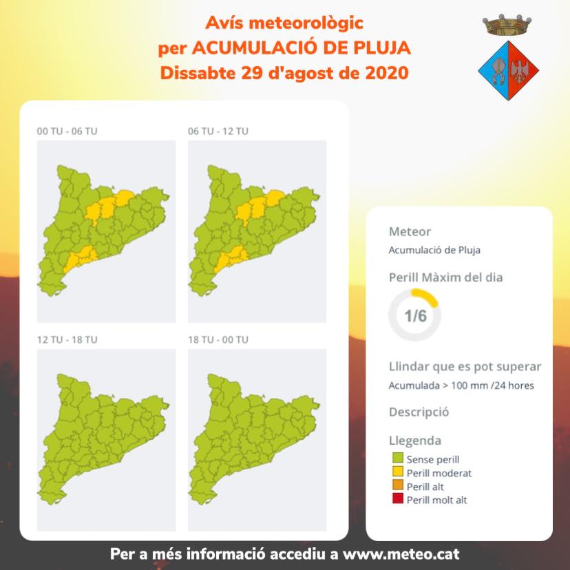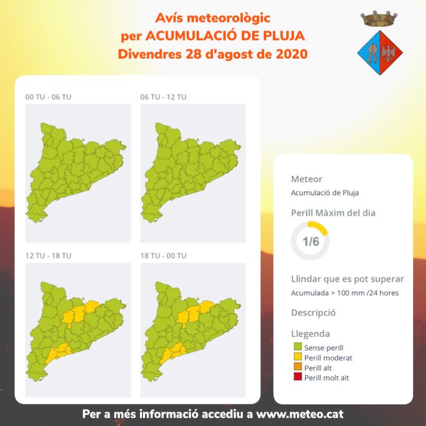 El Servei Meteorològic de Catalunya ha emitido avisos por intensidad y acumulación de lluvia para el viernes y el sábado. Seguid las recomendaciones de Protección Civil. En caso de emergencia llamad al 112.