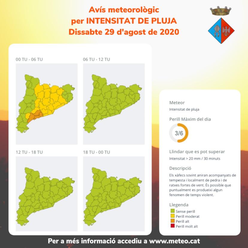 El Servei Meteorològic de Catalunya ha emès avisos per intensitat i acumulació de pluja per divendres i dissabte. Seguiu les recomanacions de Protecció Civil. En cas d’emergència, truqueu al 112.