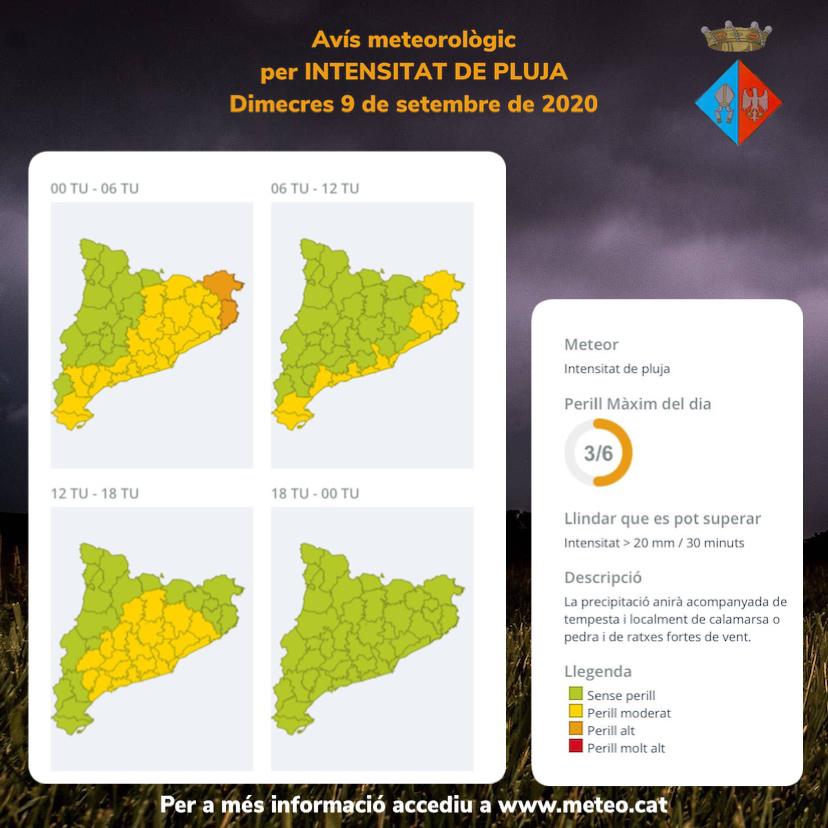 ACTUALITZADA 8/9/20 a les 18h-Avís per pluja per al dimarts 8 i el dimecres 9 de setembre