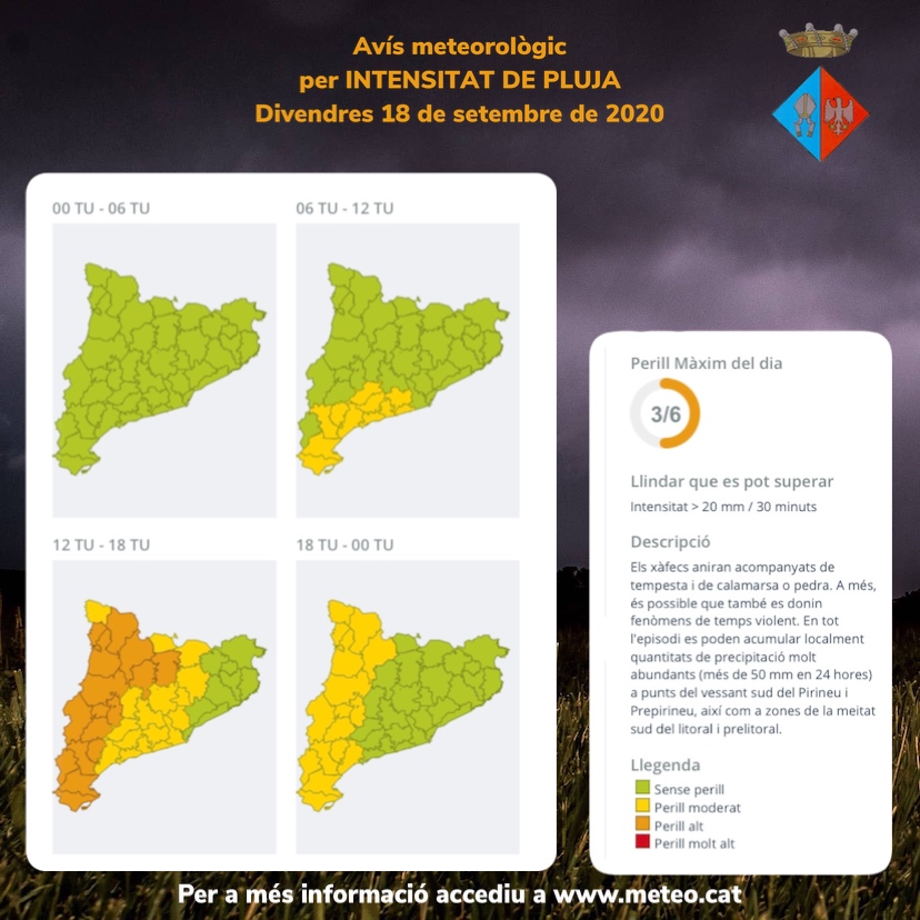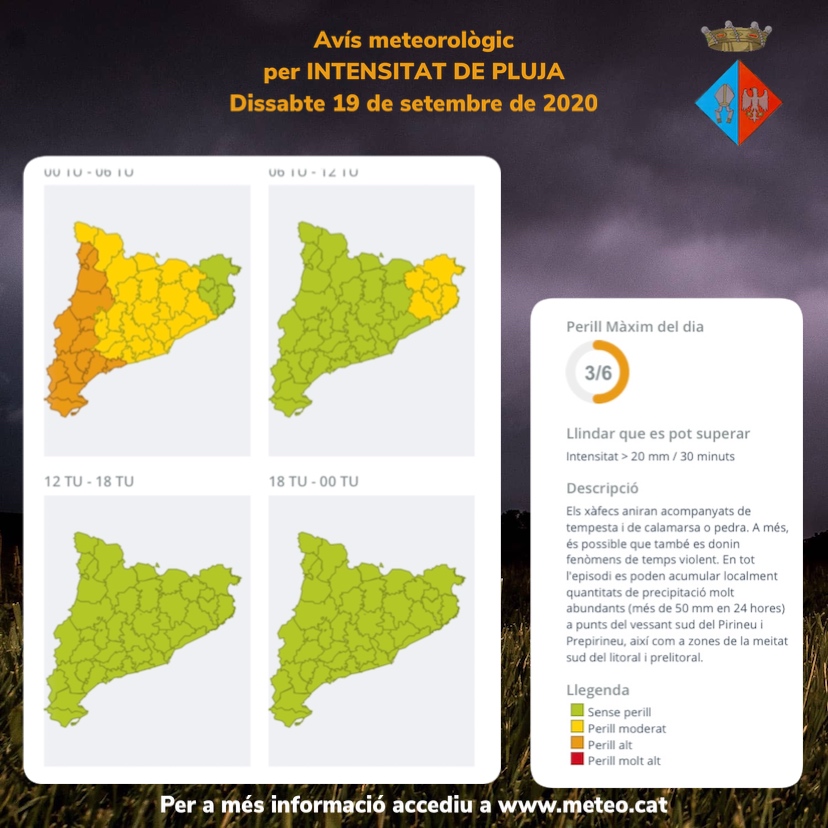 CASTELLANO | El Servei Meteorològic de Catalunya ha publicado un aviso por lluvias intensas para hoy viernes y la madrugada del viernes al sábado. Protección Civil ha activado el plan Inuncat. Los chubascos irán acompañados de tormenta y de granizo o piedra. Es posible que también se den fenómenos de tiempo violento. Extremad las precauciones y seguid las indicaciones de Protección Civil.