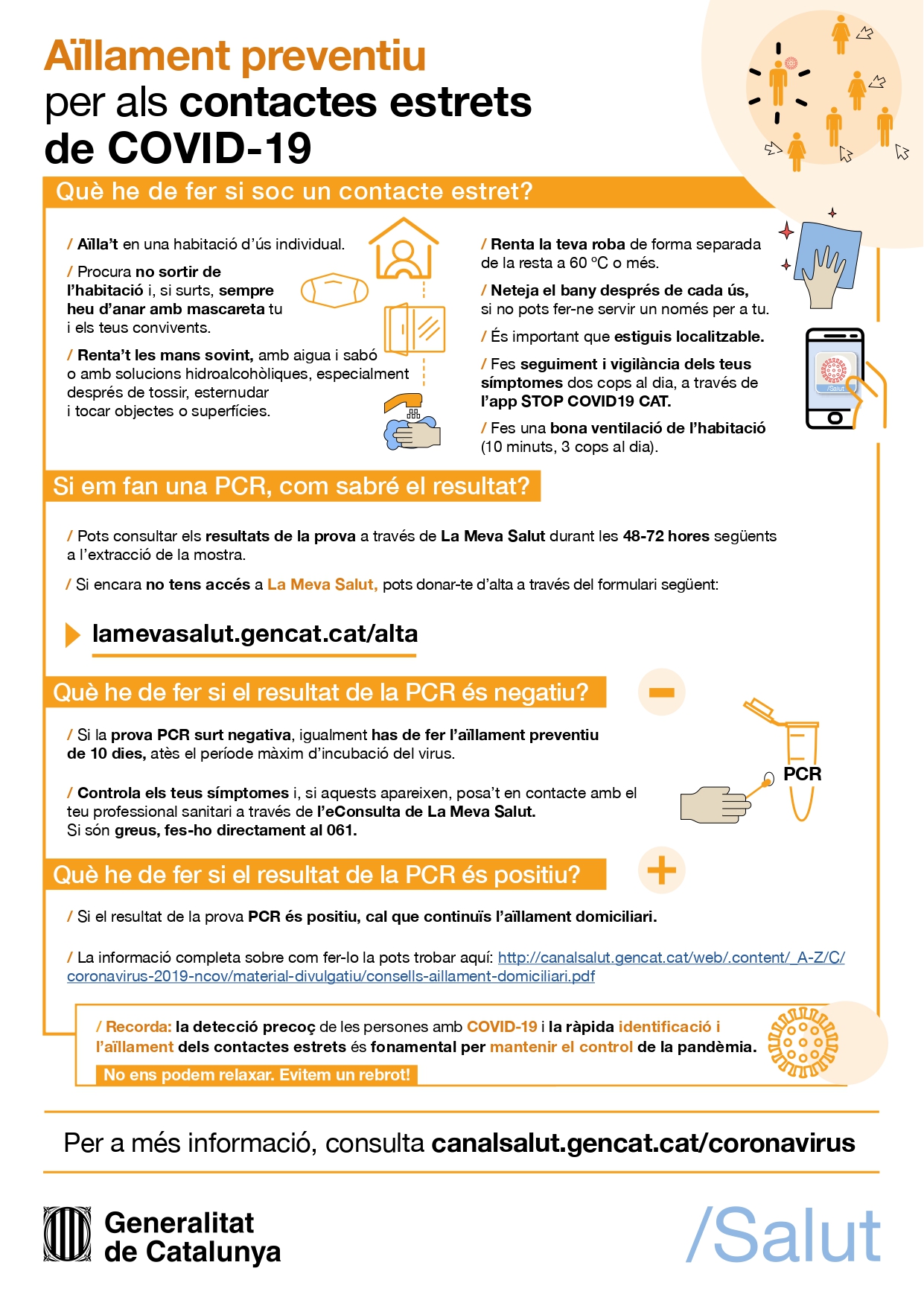 El Departamento de Salud de la Generalitat de Catalunya informa de que: Un contacto estrecho de un positivo en COVID-19 son las personas con las que habéis compartido:
