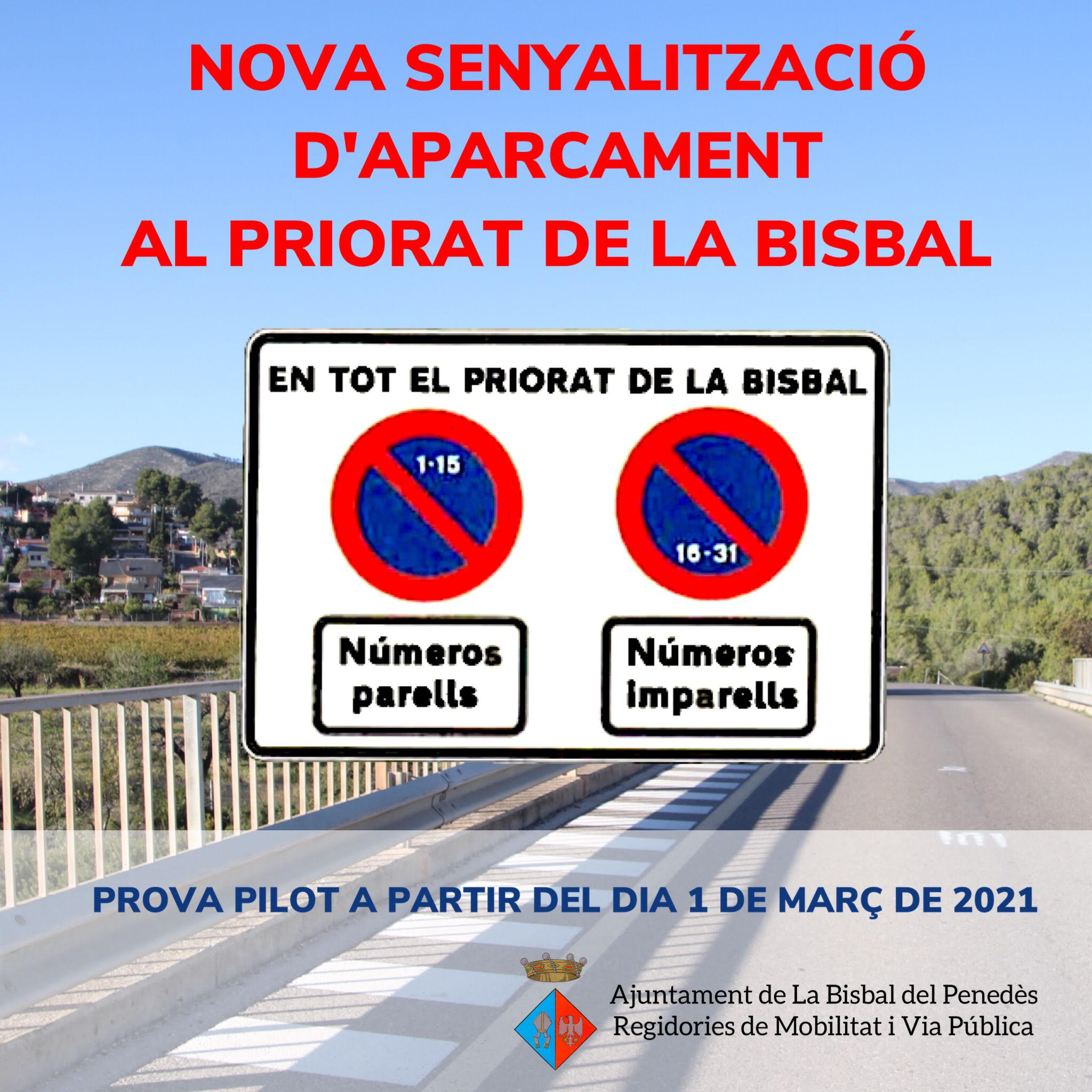 Las concejalías de Movilidad y Vía Pública modificarán el sistema de aparcamiento del Priorat de la Bisbal a partir del día 1 de marzo con el objetivo de mejorar la ordenación y circulación de vehículos en la urbanización. Del día 1 al día 15 de cada mes estará prohibido aparcar delante de los números pares y del 16 al 31 no se podrá aparcar delante de los números impares. El Ayuntamiento colocará señalización informativa en las entradas del Priorat.La concejala de Movilidad y Vía Pública, Leo Uceda, ha explicado que se trata de una prueba piloto que está previsto que se implante en otras urbanizaciones del municipio, una vez se haya visto cómo ha funcionado en el Priorat.