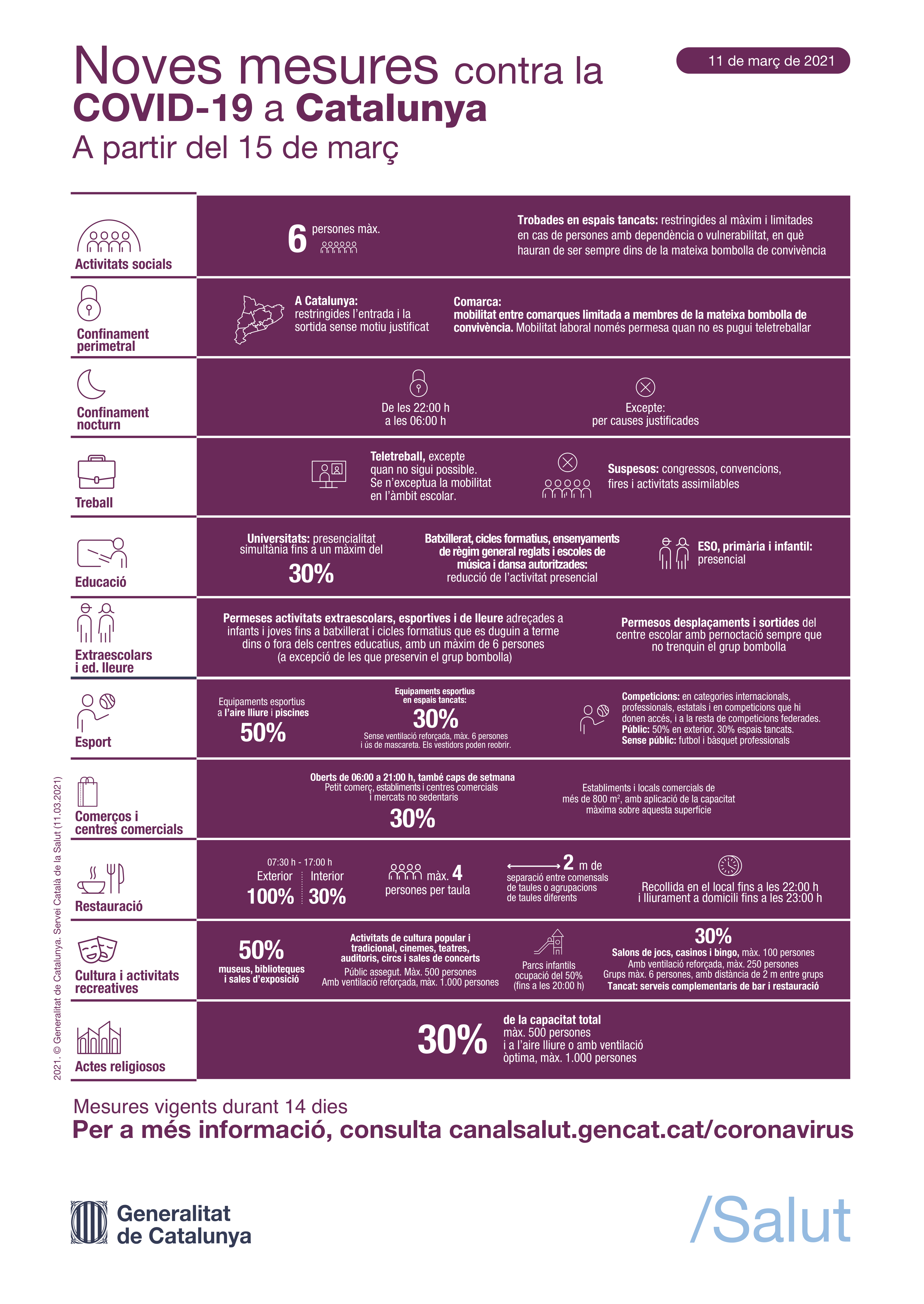 A partir del 15 de març entren en vigor noves mesures. Trobareu més informació o per descarregar-vos la infografia en pdf podeu entrar a https://canalsalut.gencat.cat/ca/salut-a-z/c/coronavirus-2019-ncov/ciutadania/mesures/15-marc/