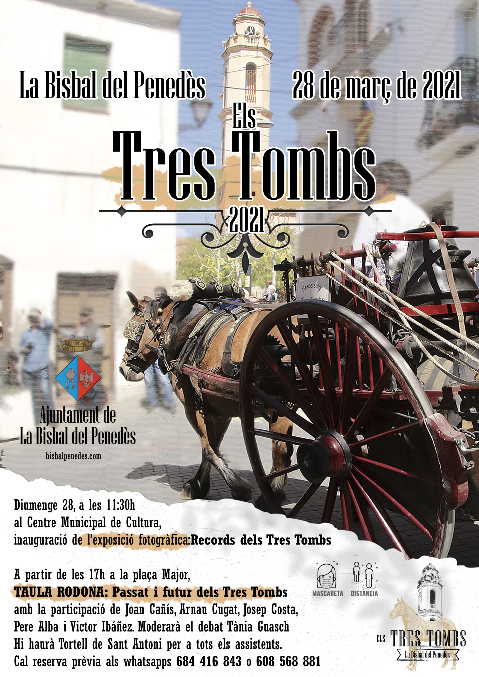 CASTELLANO | El Ayuntamiento de La Bisbal del Penedès se adapta a las circunstancias sanitarias actuales y organiza una exposición y una mesa redonda sobre los Tres Tombs, ya que este año no podrán salir los carros, los caballos y sus jinetes. Los actos tendrán lugar el domingo 28 de marzo. A las 11:30h se inaugurará la exposición fotográfica “Records dels Tres Tombs”. El mismo día, a partir de las 17h, tendrá lugar la mesa redonda: Pasado y futuro de los Tres Tombs.
