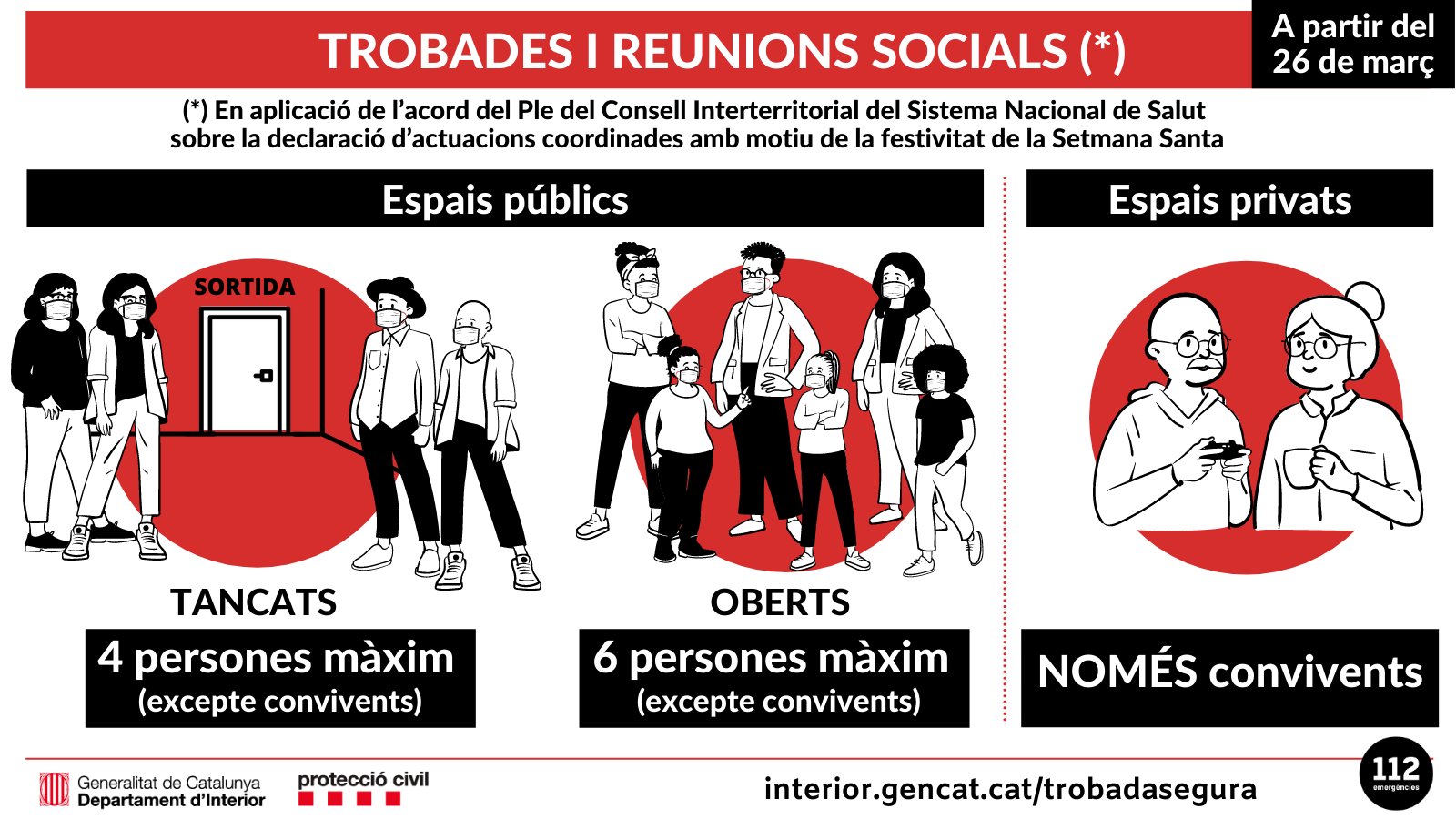 4 persones màxim en llocs tancats i 6 en llocs oberts (excepte convivents)