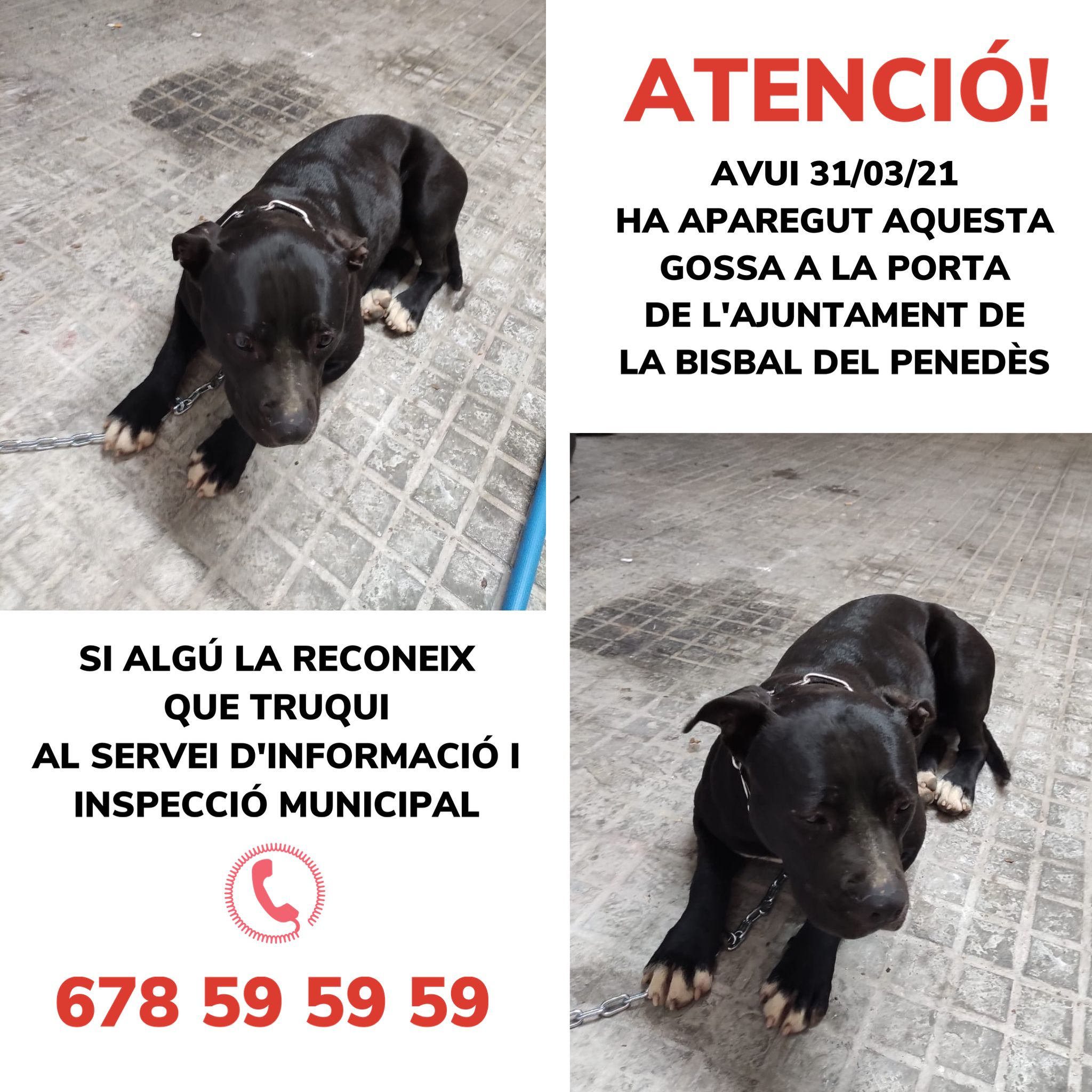 Ha aparegut aquesta gossa al davant de l’Ajuntament de La Bisbal del Penedès. Si la reconeixeu, truqueu al 678 59 59 59.