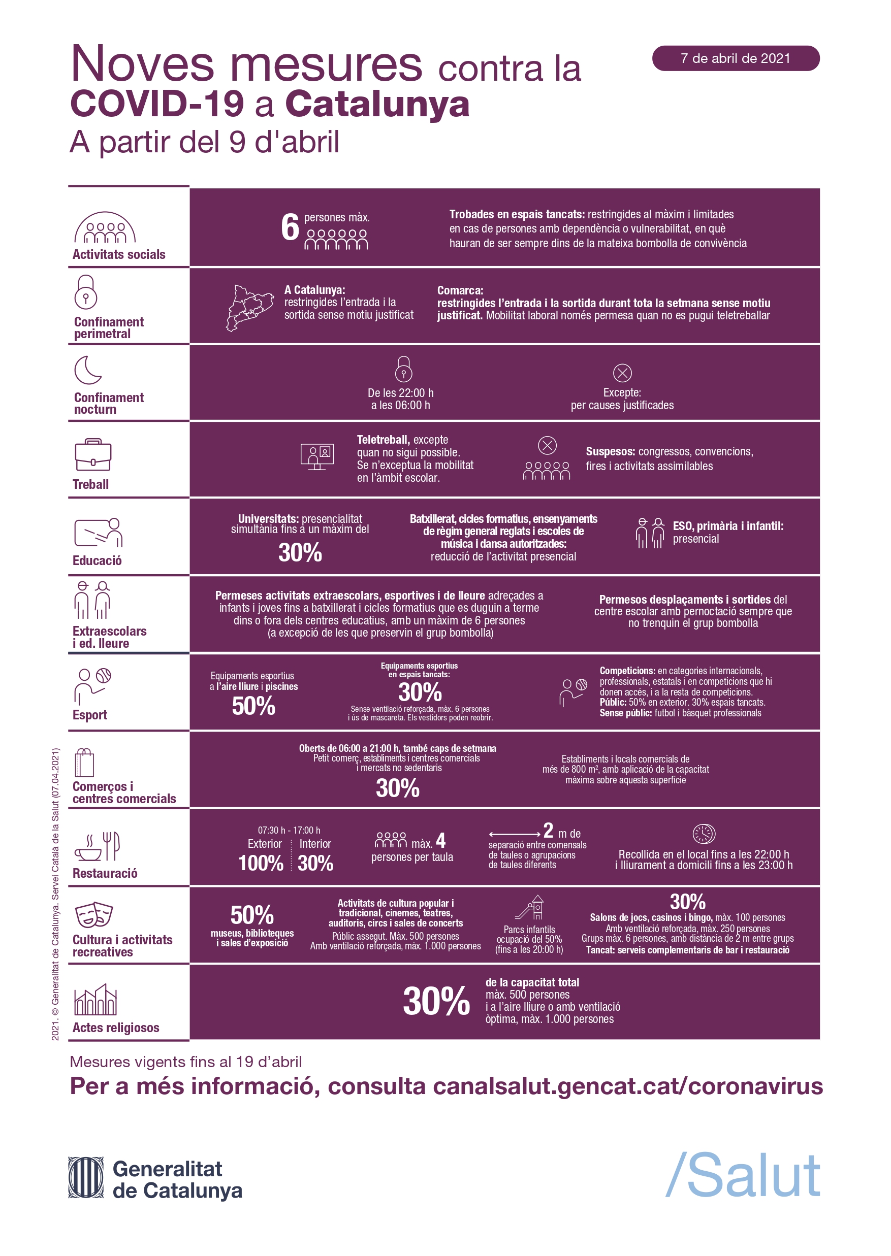 La resta de mesures, com ara el confinament nocturn de 22h a 06h, es mantenen. Podeu consultar les mesures a la infografia adjunta.