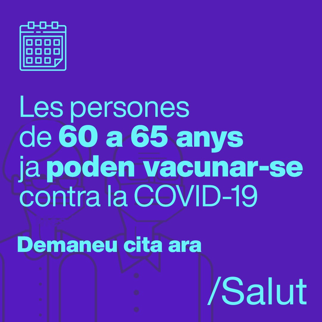 Las personas de entre 60 y 65 años ya pueden pedir hora para vacunarse contra la COVID-19. Podéis pedir cita accediendo al siguiente enlace: https://vacunacovid.catsalut.gencat.cat/inici?qtoken=7998e025-a978-496d-850b-48b0283d05b1