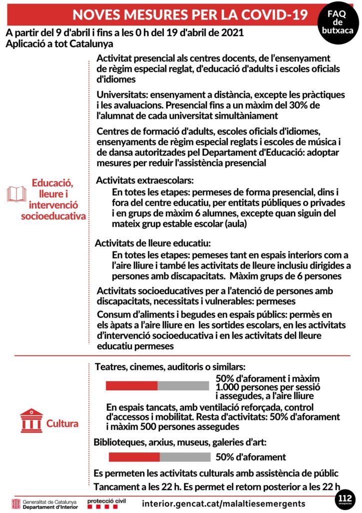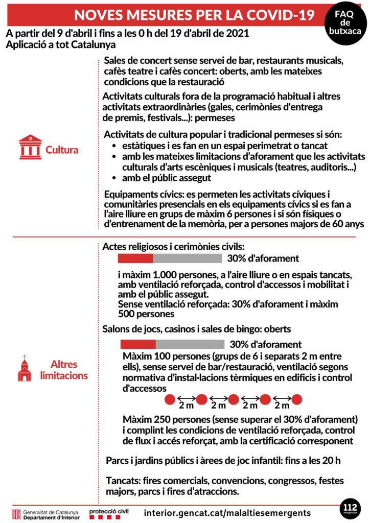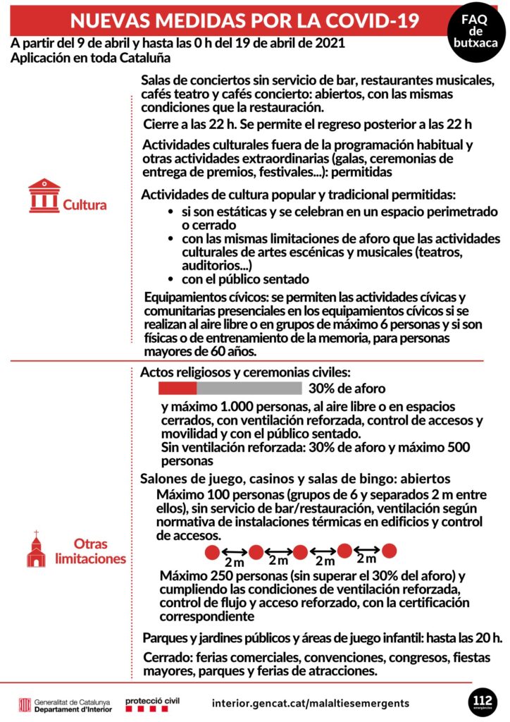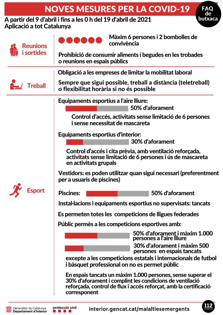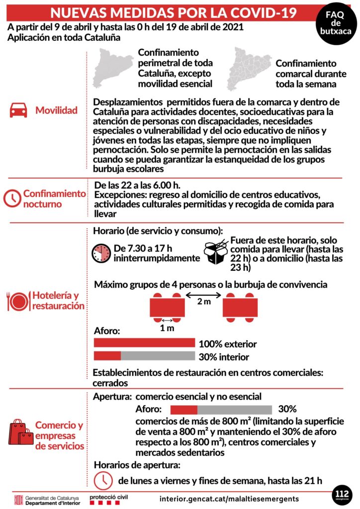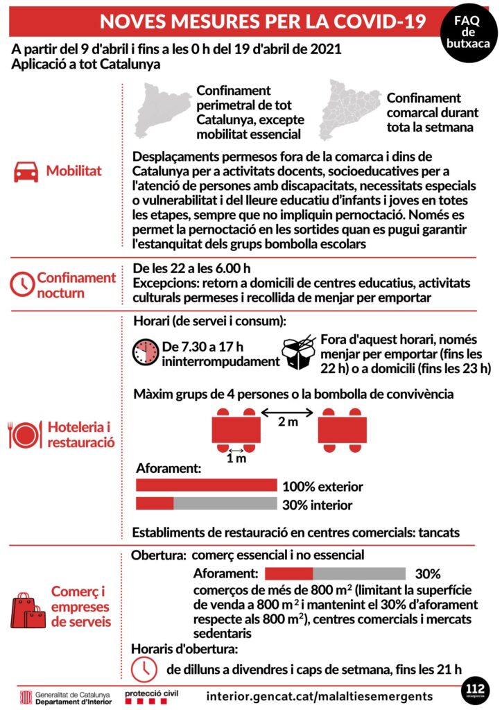 Estas son las medidas vigentes desde el pasado viernes 9 de abril. Para más información podéis acceder al enlace: https://canalsalut.gencat.cat/ca/salut-a-z/c/coronavirus-2019-ncov/