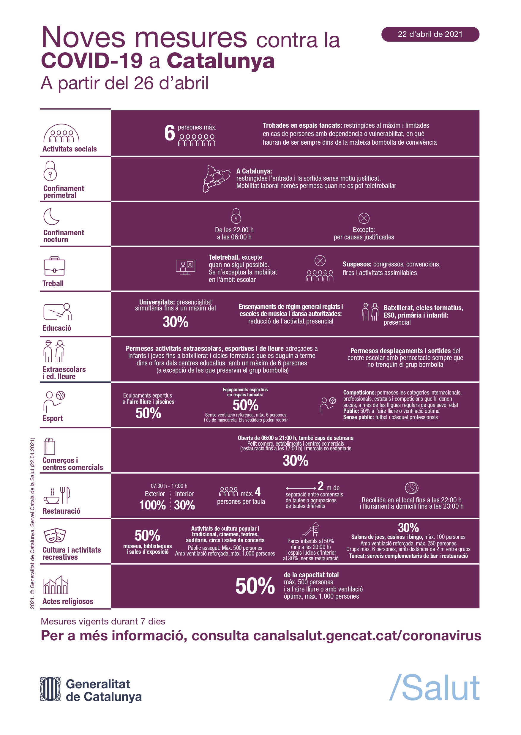 Os adjuntamos las medidas que entrarán en vigor el próximo lunes 26 de abril. Para más información podéis acceder al enlace: https://canalsalut.gencat.cat/ca/salut-a-z/c/coronavirus-2019-ncov/