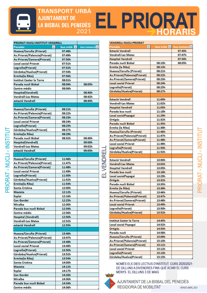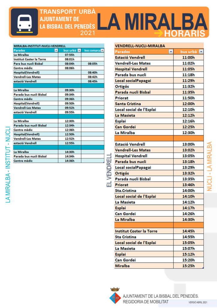 CASTELLANO | El lunes 3 de mayo empieza un nuevo servicio de bus urbano y comarcal entre el núcleo, las urbanizaciones y El Vendrell. Este nuevo servicio se vehicula a través de un convenio con la Generalitat de Catalunya, cuya aprobación se elevará al Pleno extraordinario previsto para el viernes 30 de abril.