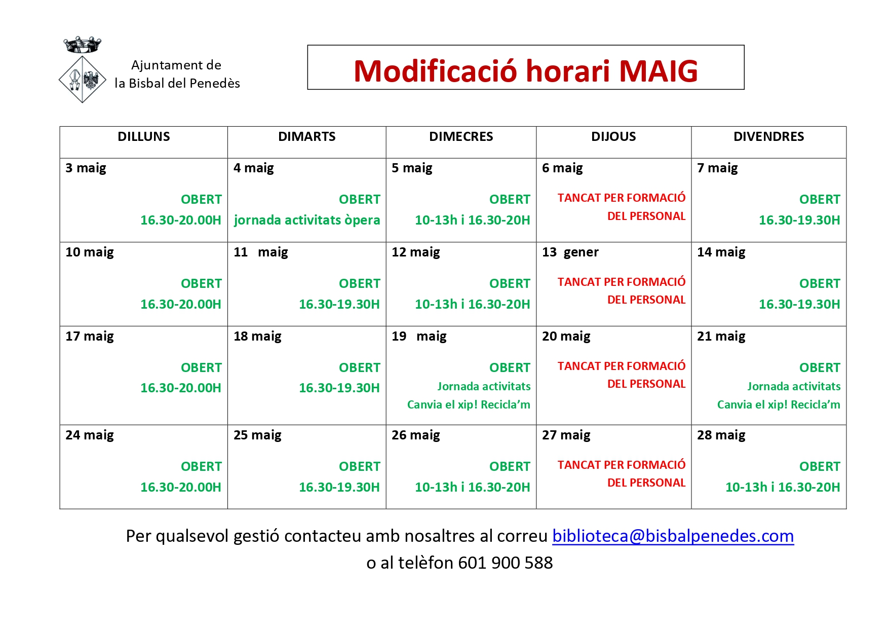 Aquest mes de maig la biblioteca modificarà els seus horaris d’obertura. La modificació més destacada és el tancament dels dijous a la tarda i, en contrapartida, l’obertura dels matins del dimecres. Podeu veure tots els canvis a la imatge adjunta.