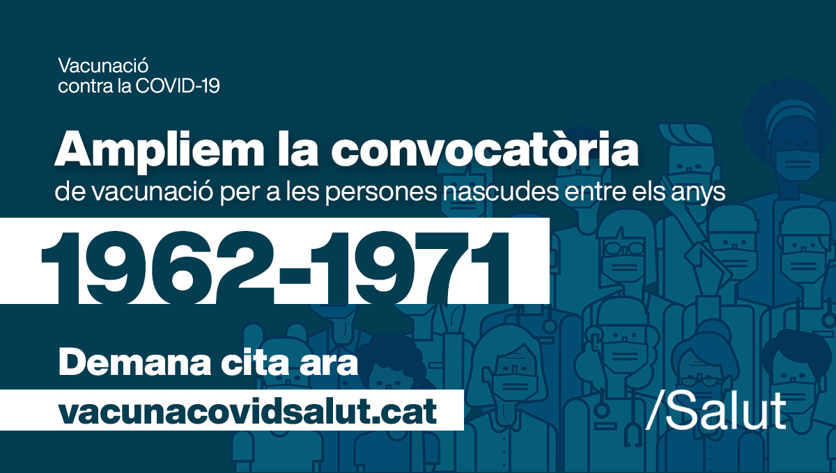 Se ha ampliado la convocatoria: si habéis nacido entre el 1962 y el 1971, ya podéis solicitar hora para vacunaros. Pedid cita en vacunacovidsalut.cat