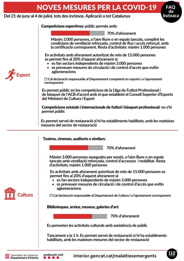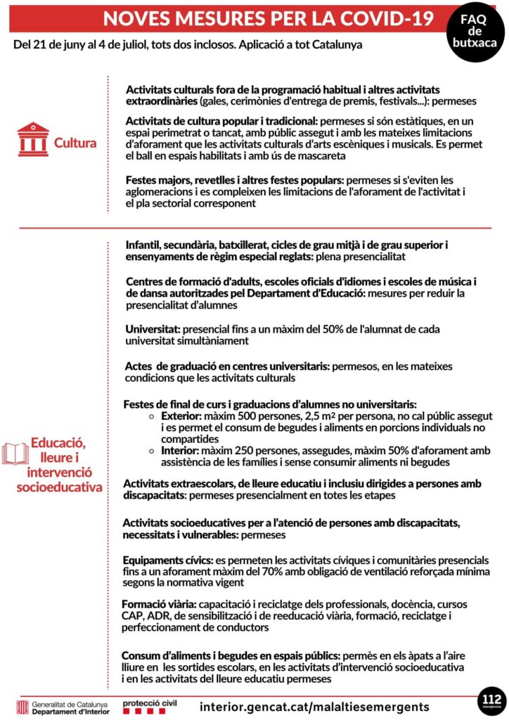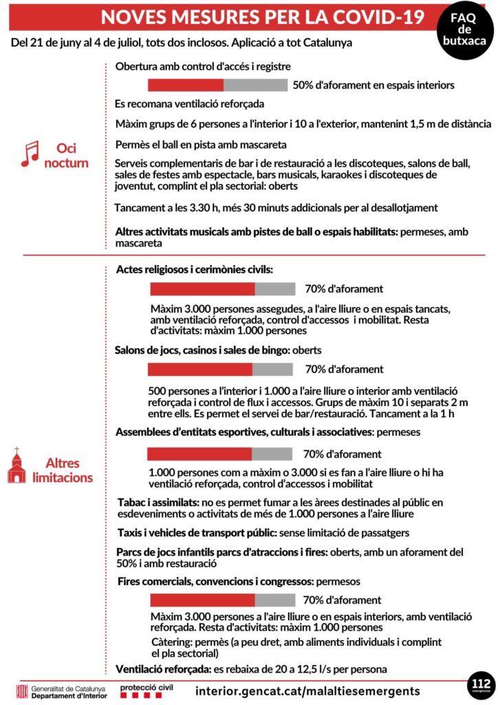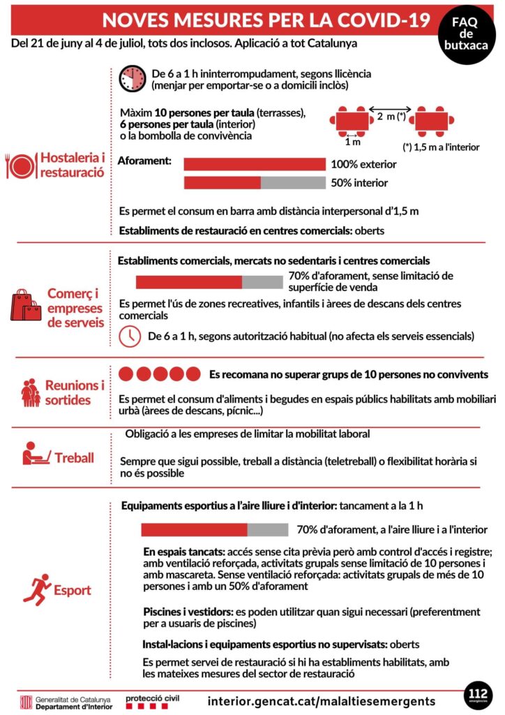 Estas son las medidas por la COVID-19 que estarán en vigor hasta el 4 de julio. Para más información podéis acceder a la web: https://canalsalut.gencat.cat/ca/salut-a-z/c/coronavirus-2019-ncov/ciutadania/mesures/21-juny/