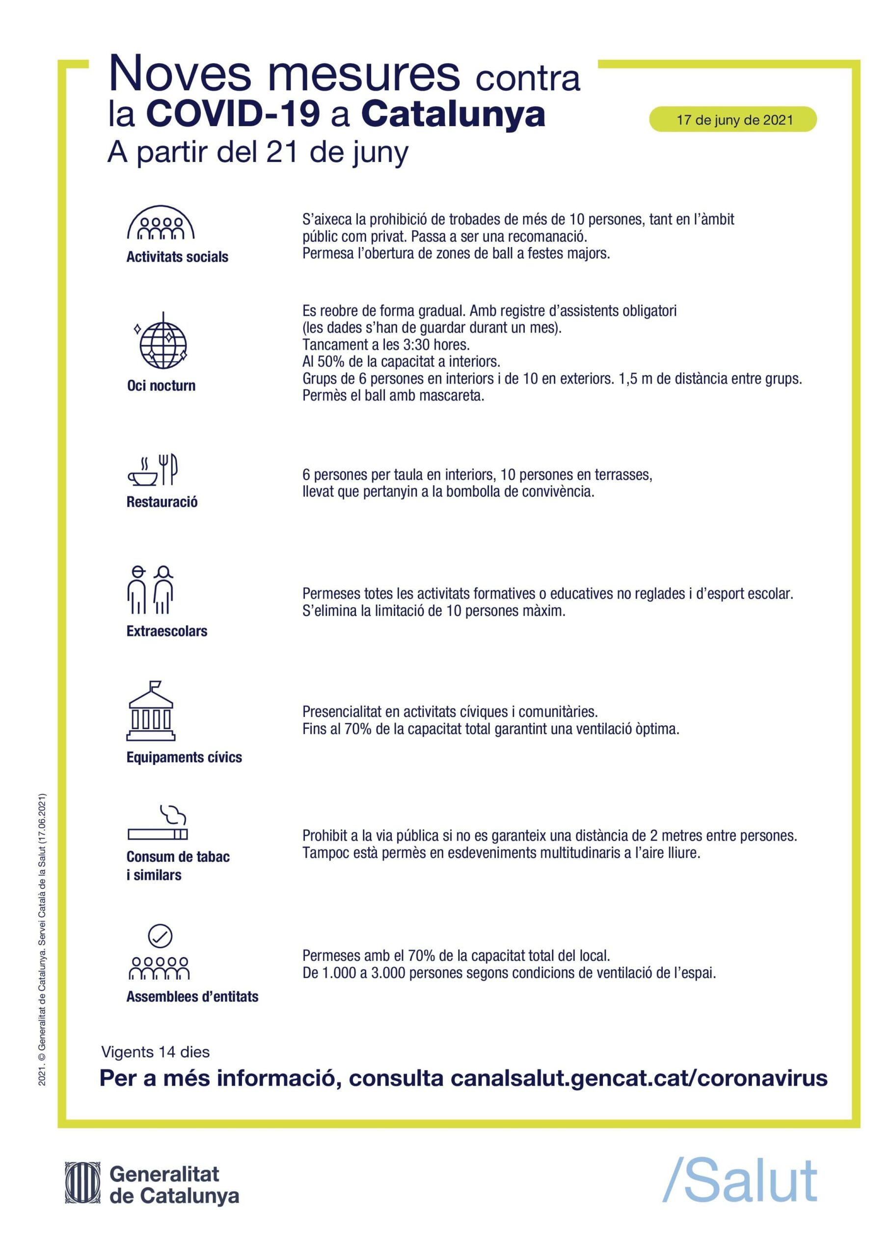 Aquestes són les mesures per la COVID-19 que estaran en vigor fins al 4 de juliol. Per a més informació podeu accedir al web: https://canalsalut.gencat.cat/ca/salut-a-z/c/coronavirus-2019-ncov/ciutadania/mesures/21-juny/