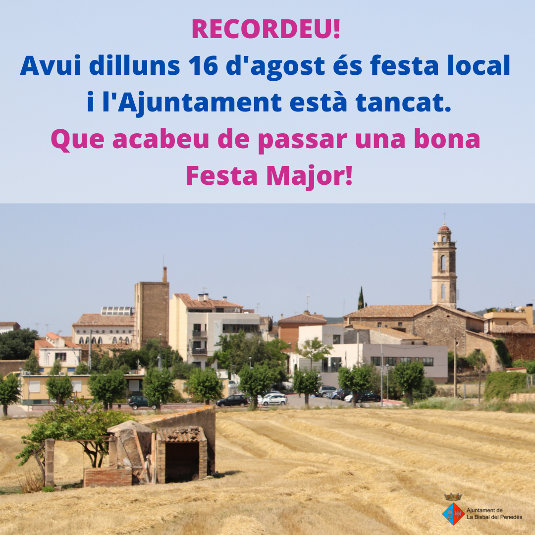 Avui dilluns 16 d’agost és festa local i l’Ajuntament de La Bisbal del Penedès està tancat. Que acabeu de passar una bona Festa Major!