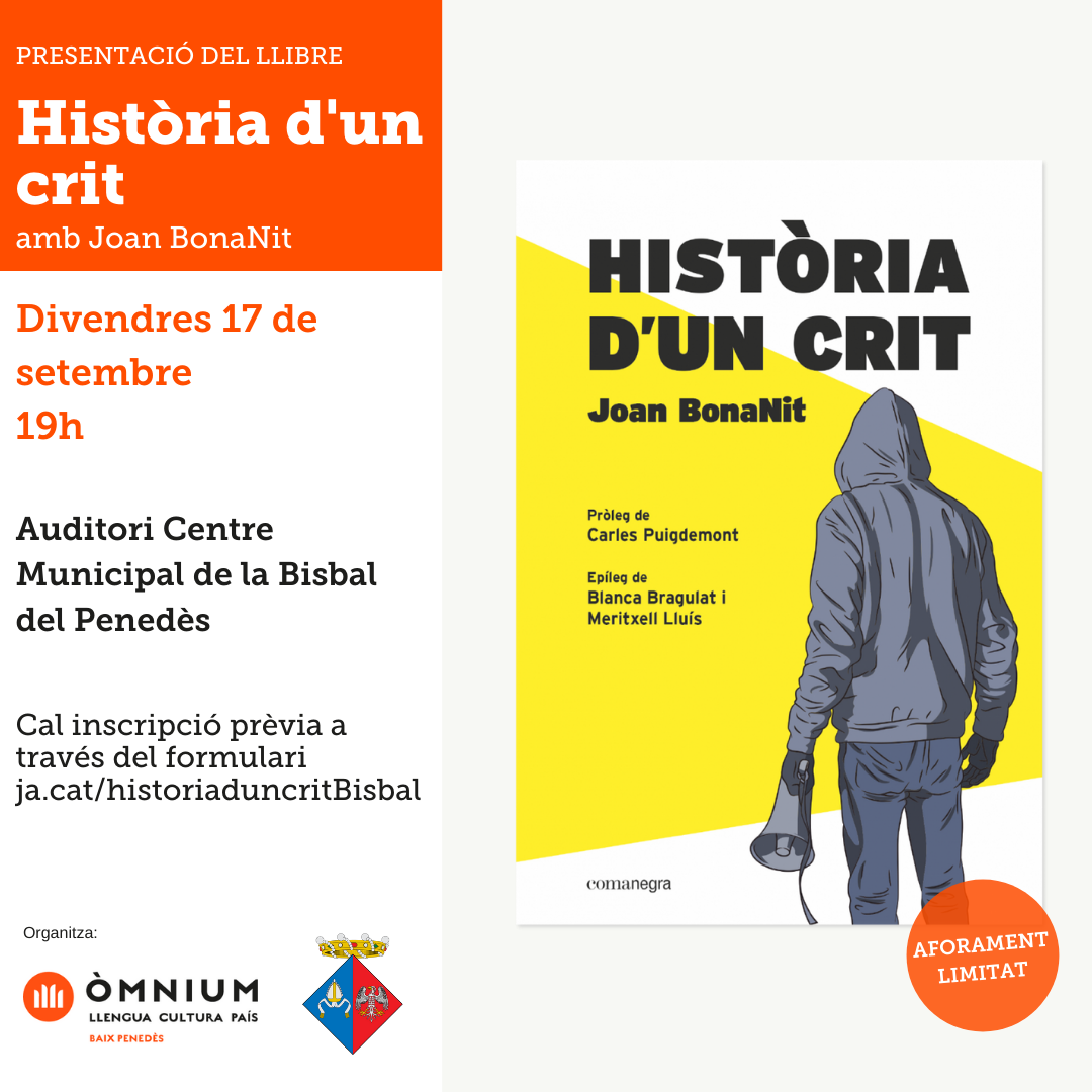 El Centro Municipal de Cultura acogerá la presentación del libro “Història d’un crit” de Joan BonaNit el próximo viernes 17 de septiembre, a las 19h.
