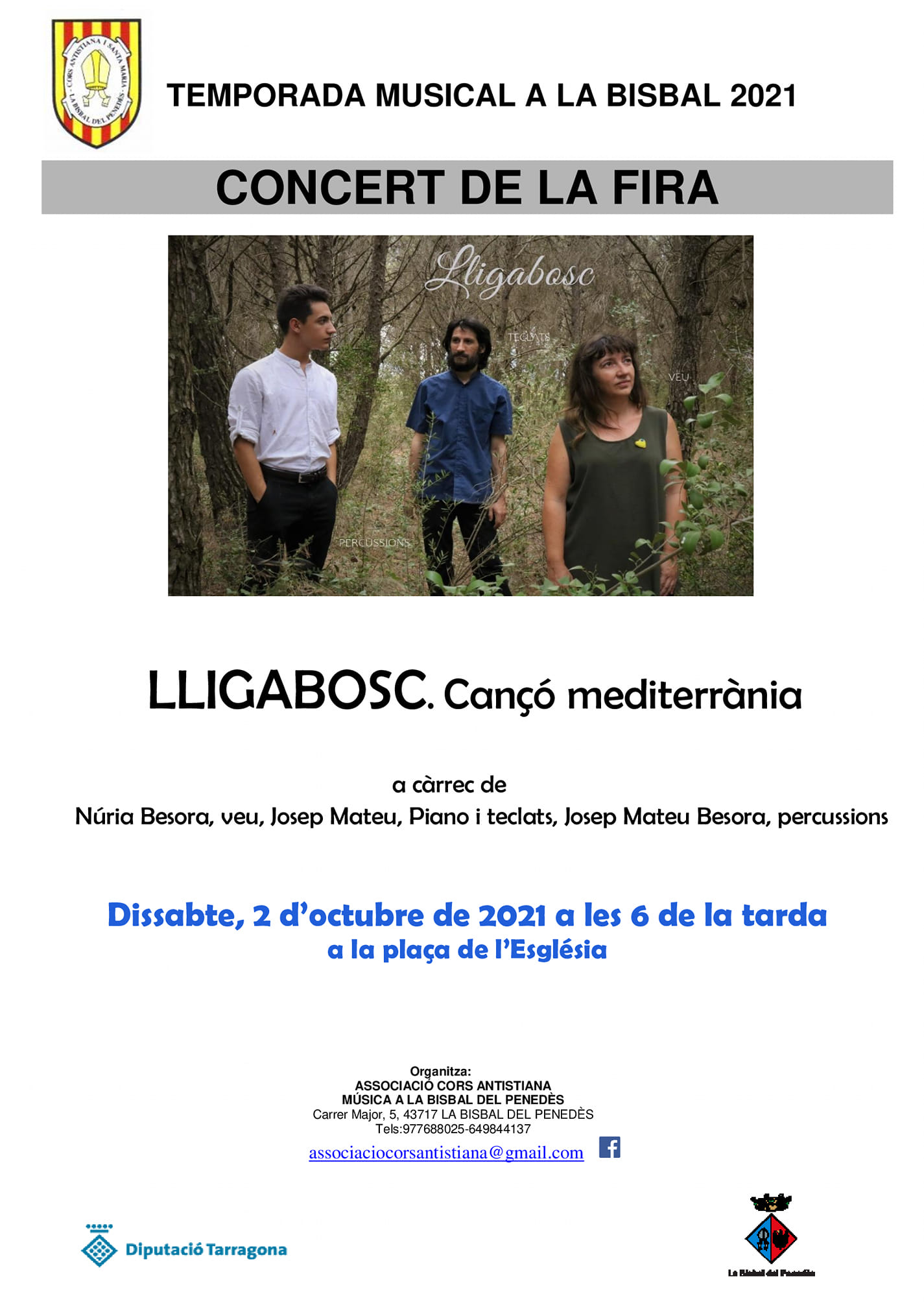 L’Associació de Cors Antistiana ha organitzat un concert amb ‘Lligabosc’ amb motiu de la Fira. Tindrà lloc demà dissabte, a les 18h, a l’Església de Santa Maria. Per a més informació podeu consultar el cartell adjunt.