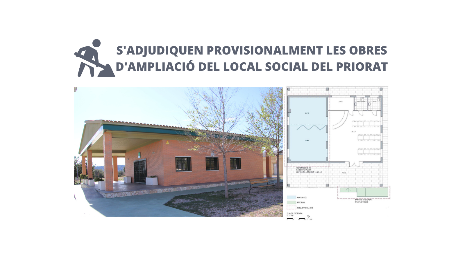 CASTELLANO | La Junta de Gobierno del lunes 25 de octubre ha adjudicado -provisionalmente- las obras de ampliación del local social del Priorat a la empresa Excavacions i Transports Rovira S.A., por un importe de 63.398,20€ y un plazo de ejecución de las obras de cinco meses y dos semanas.