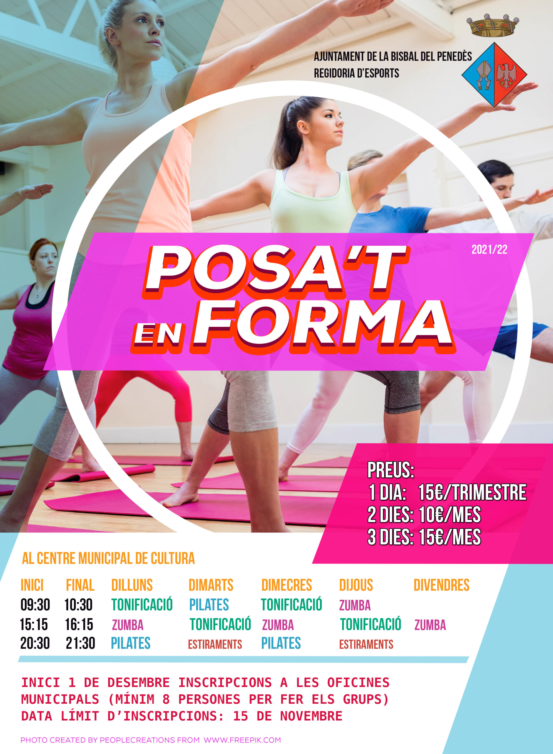 La Regidoria d’Esports ofrece las actividades de tonificación, pilates, Zumba y estiramientos. Se ofrecen actividades por la mañana, al mediodía y a última hora de la tarde en el CMC. Las clases empiezan el 1 de diciembre y las inscripciones hay que hacerlas en las oficinas municipales, como máximo, el 15 de noviembre.