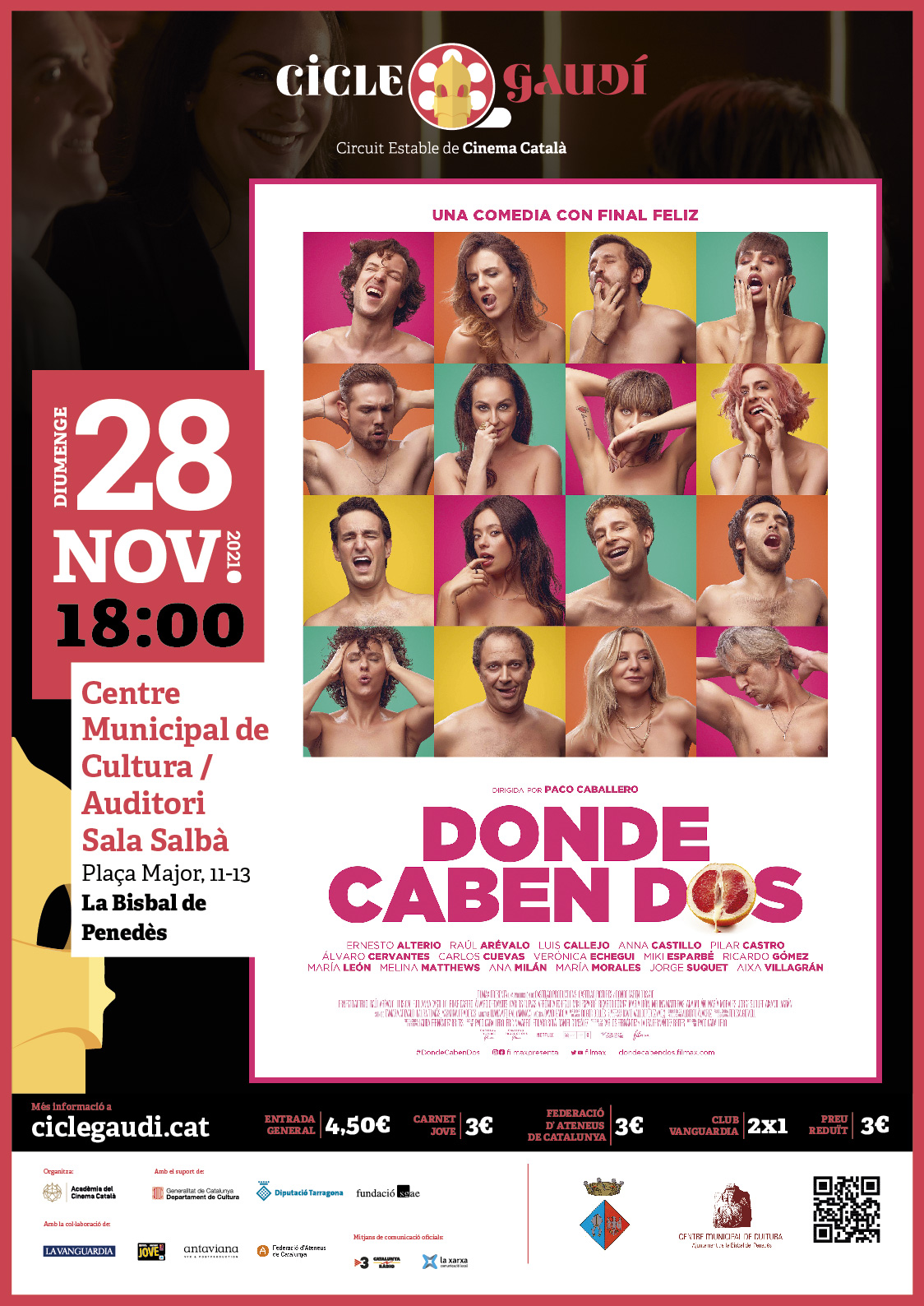 El proper diumenge 28 de novembre, a les 18h, projectarem la pel·lícula “Donde caben dos” del Cicle Gaudí al Centre Municipal de Cultura. El preu general de l’entrada és de 4,5€ i s’ofereix un preu reduït de 3€ presentant el carnet de la Biblioteca Municipal de la Bisbal.