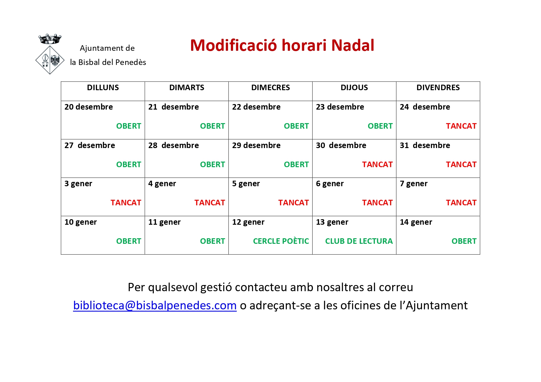 Horari de la Biblioteca pública durant les festes de Nadal i Reis