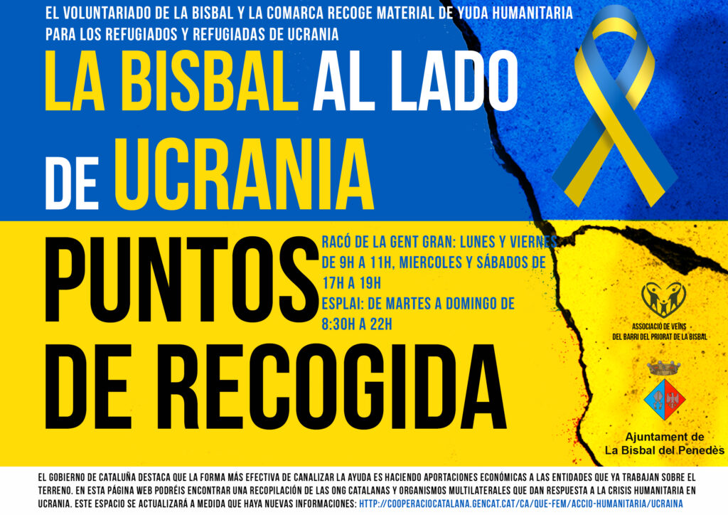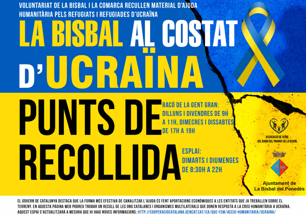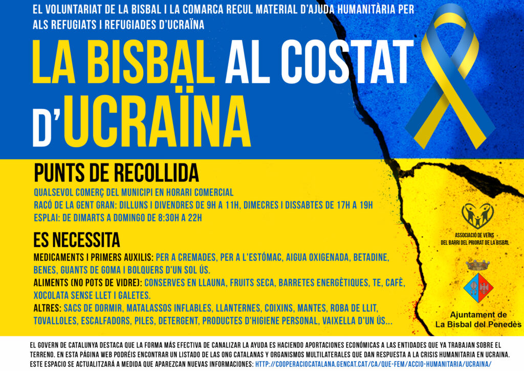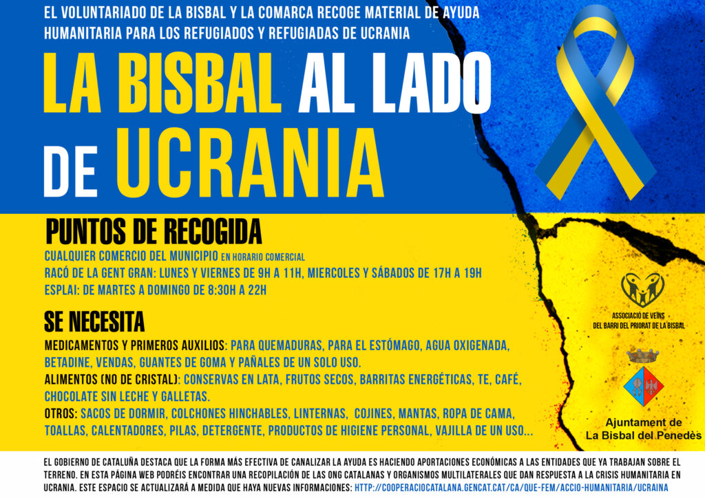 Continúa la recogida de material de ayuda humanitaria para los refugiados y refugiadas de Ucrania.Os adjuntamos los carteles con toda la información y los horarios de los puntos de recogida, ubicados en los comercios, en l’Esplai y El Racó de la Gent Gran.