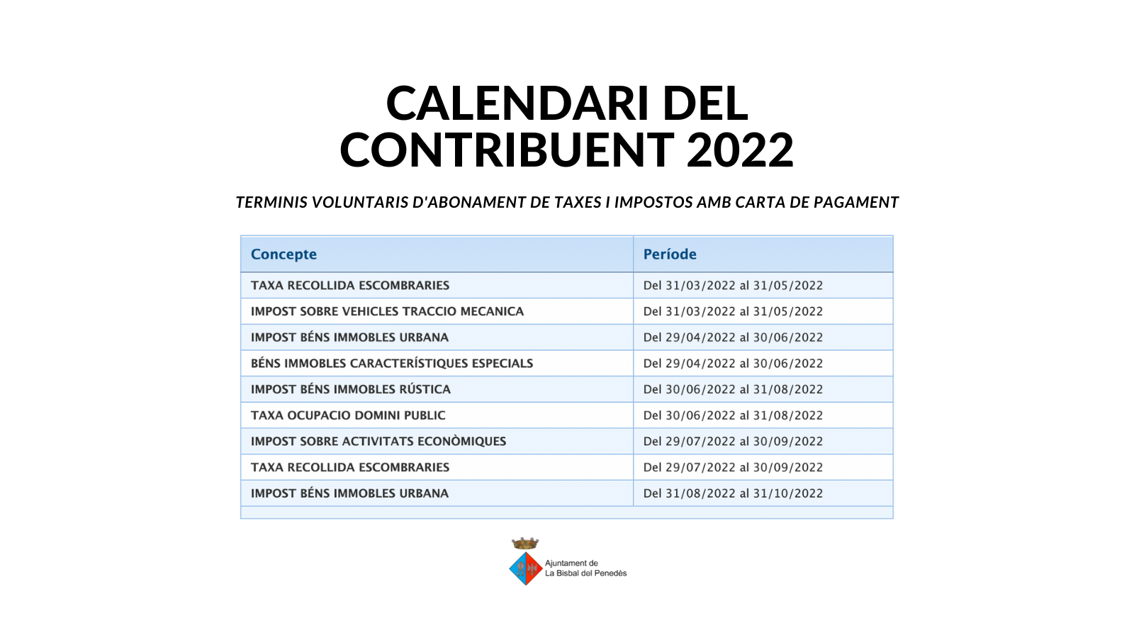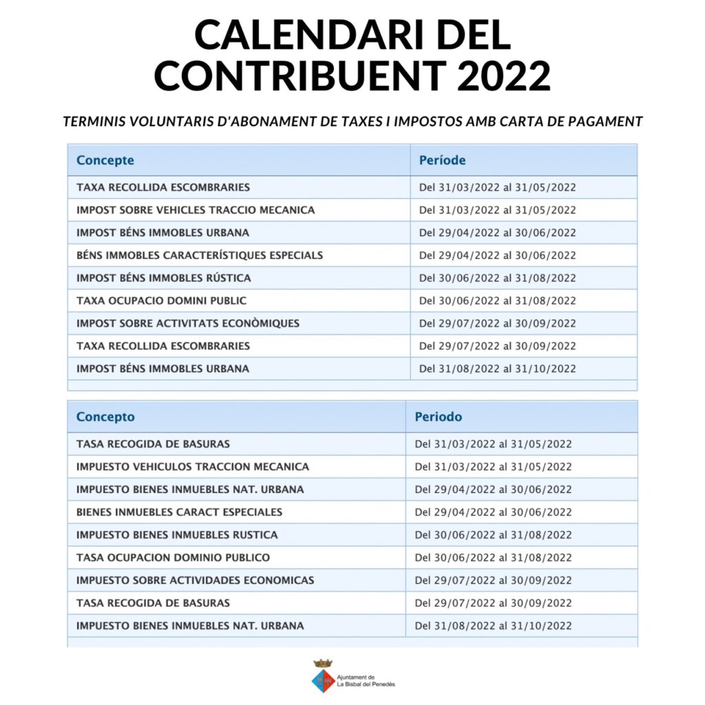 Aquest dijous 31 de març han començat els terminis de pagament -en període voluntari- dels rebuts d’una taxa i d’un impost del calendari del contribuent 2022