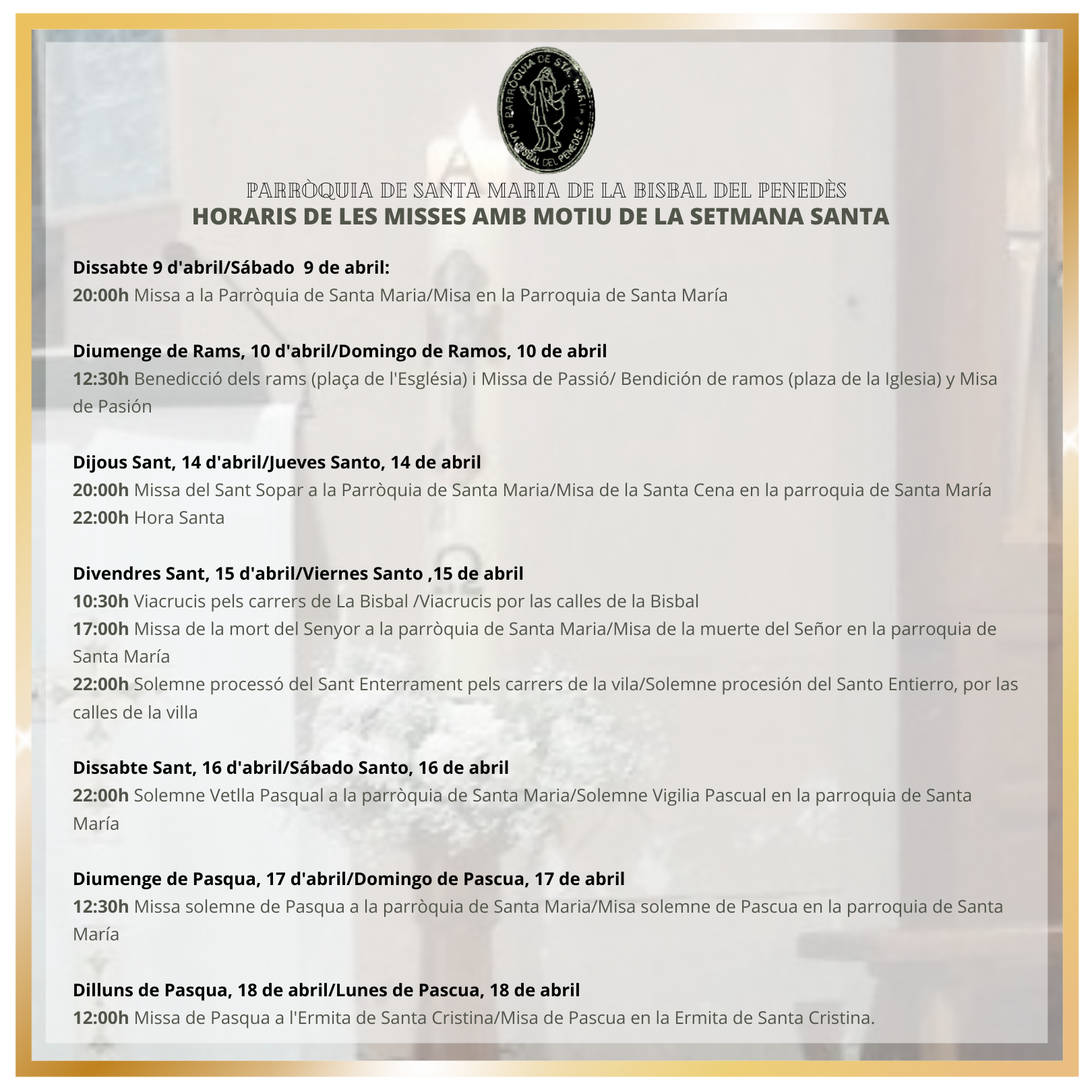 Horaris de les misses de la Parròquia de Santa Maria de la Bisbal del Penedès -i l’ermita de Santa Cristina- amb motiu de la Setmana Santa