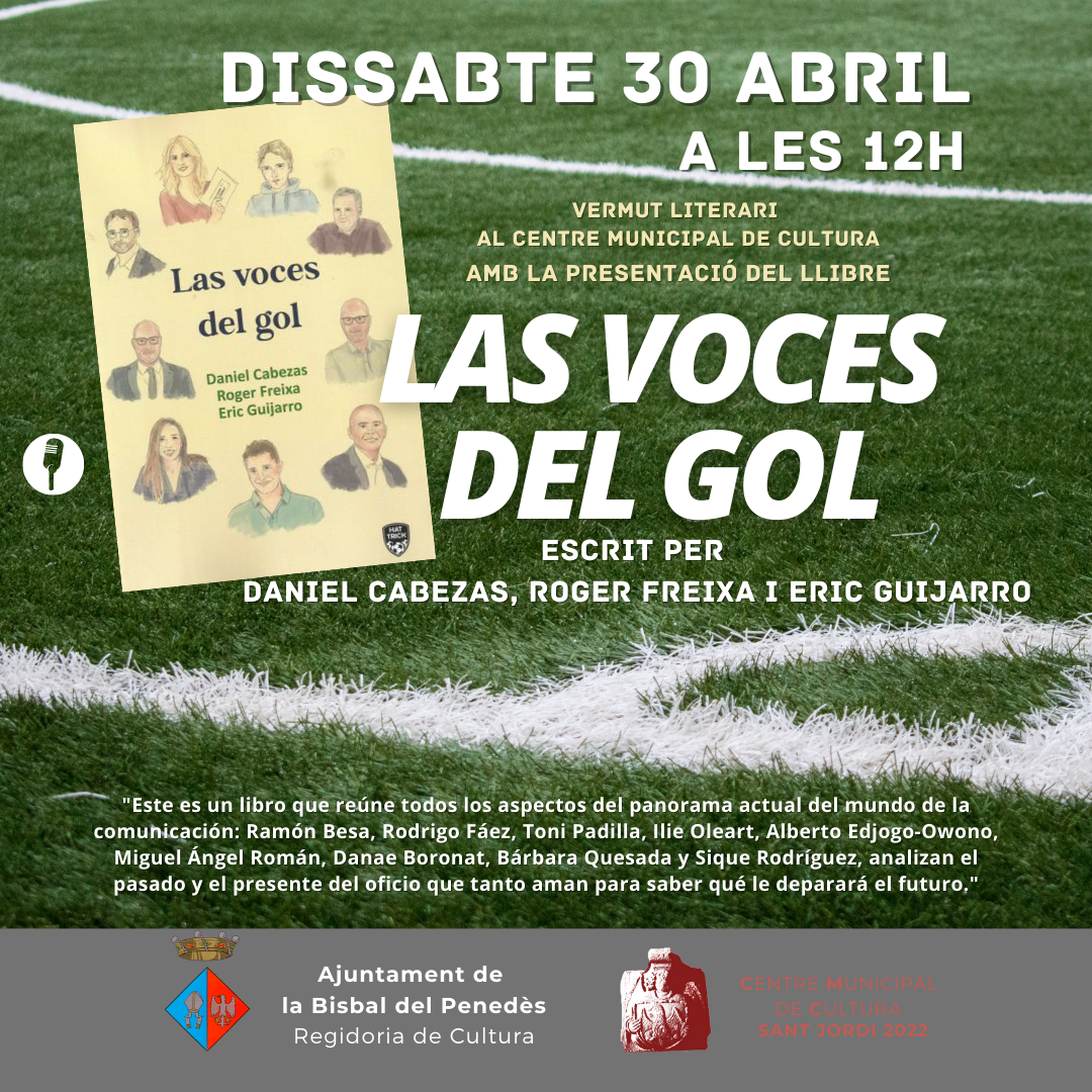 El próximo sábado 30 de abril, a las 12h, se hará un vermut literario en el CMC y se presentará el libro “Las voces del gol”, de Daniel Cabezas, Eric Guijarro y el bisbalense Roger Freixa. ¡Os esperamos!