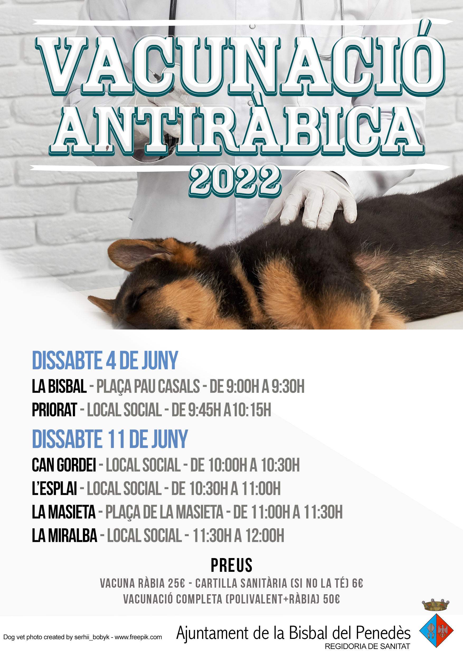 Els dies 4 i 11 de juny es durà a terme la campanya de vacunació de gossos a la Bisbal. La vacunació serà de la ràbia i/o polivalent i anirà a càrrec d’un veterinari del Col·legi Oficial de Veterinaris de la província de Tarragona, que cobrarà les taxes pertinents. Cal que presenteu la cartilla de vacunacions (si en disposeu). Les vacunes es posaran els següents dies i llocs: