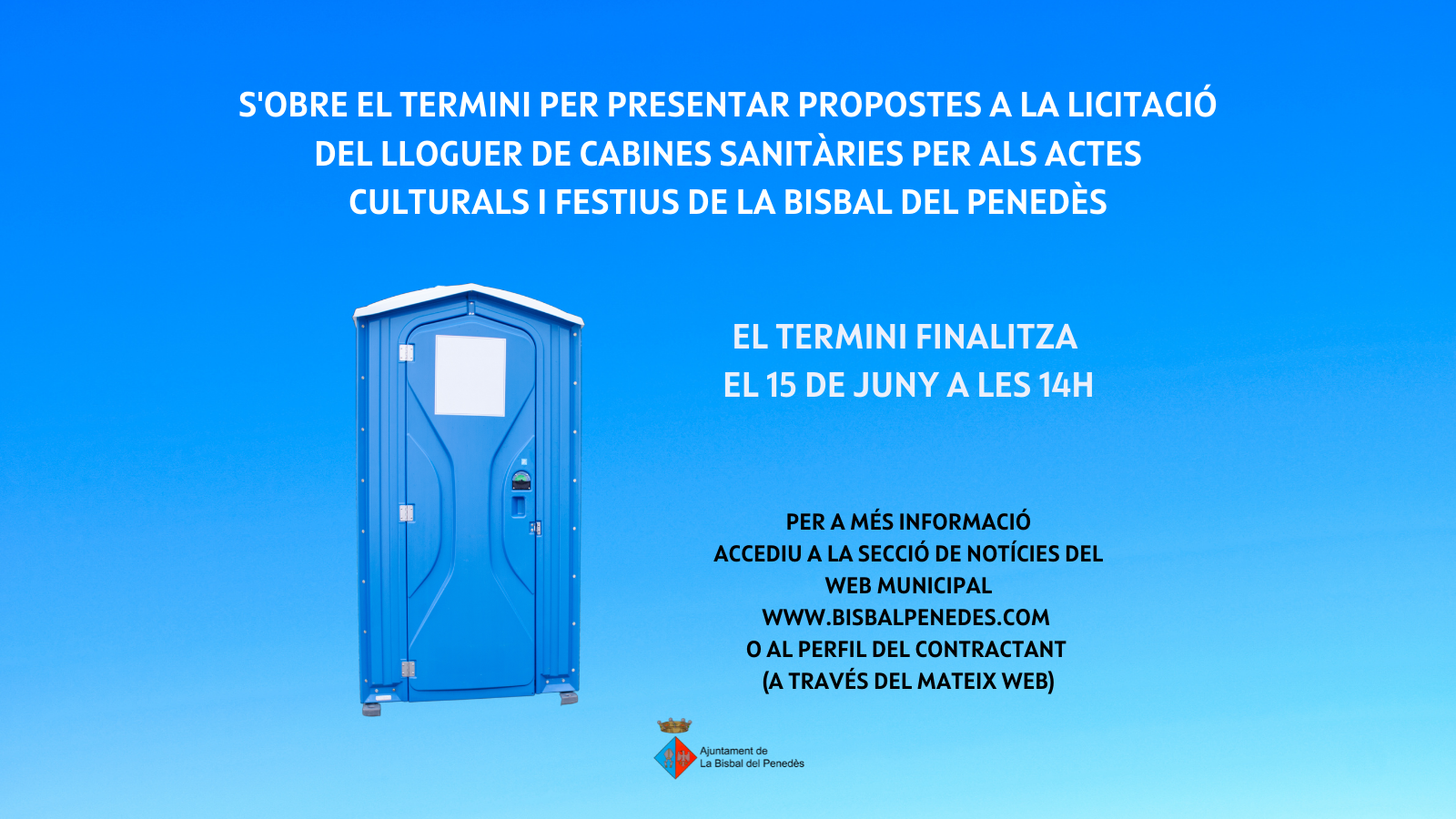 L’Ajuntament licita el lloguer de cabines sanitàries amb el transport, instal·lació, manteniment i buidatge d’aquestes per a les festes del barri de la Plaça, el barri de Baix, el barri de la Riba, les festes d’estiu de l’Ortigós, La Miralba, La Masieta, l’Esplai, Can Gordei i el Priorat i la Festa Major del municipi. Aquesta licitació tindrà una vigència d’1 any + 2 pròrrogues d’1 any cadascuna.
