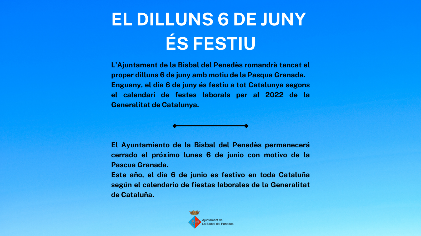L’Ajuntament de la Bisbal del Penedès romandrà tancat el proper dilluns 6 de juny.