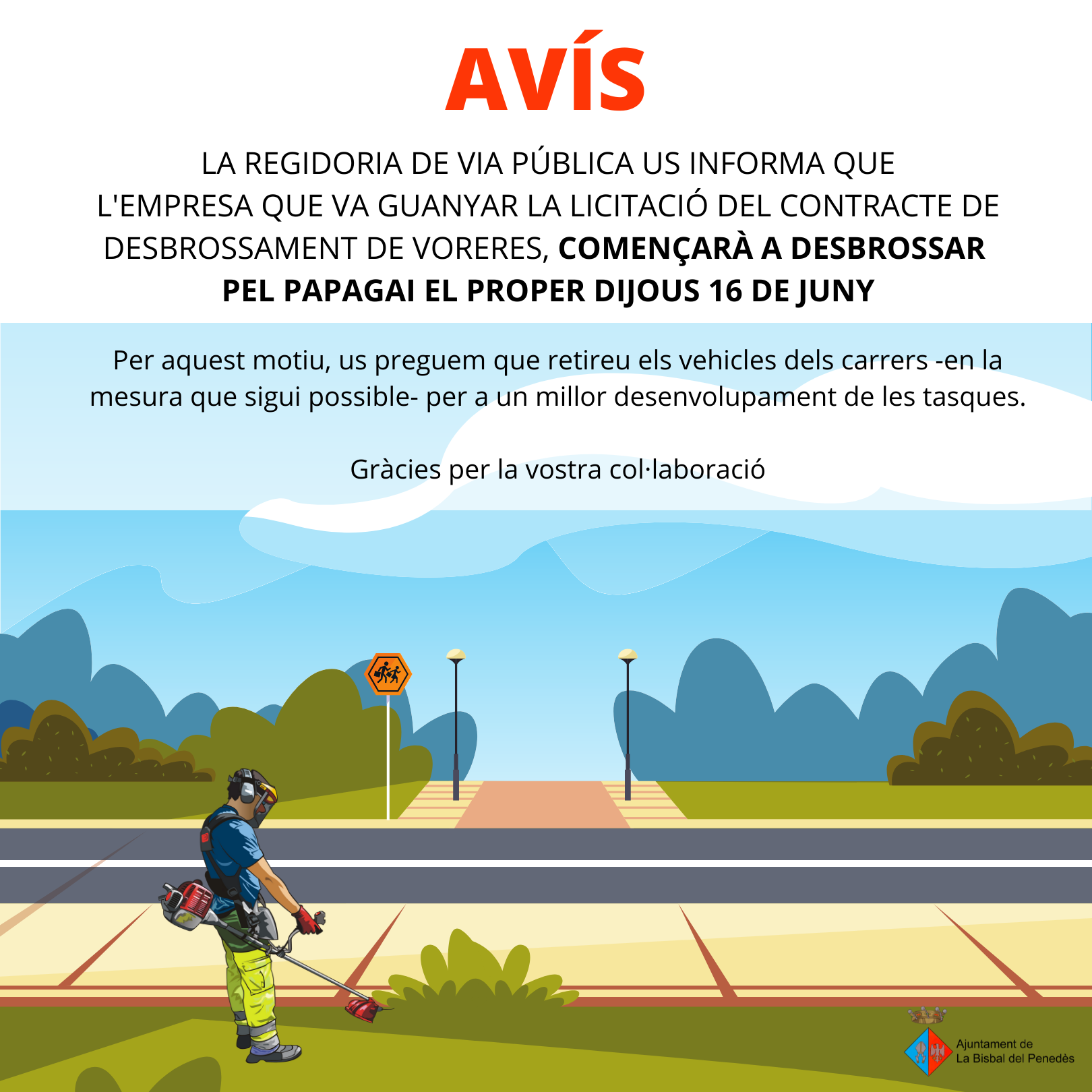 El dijous es començaran a desbrossar els carrers del Papagai. Us preguem que retireu els vehicles dels carrers per a un millor desenvolupament d’aquestes tasques.