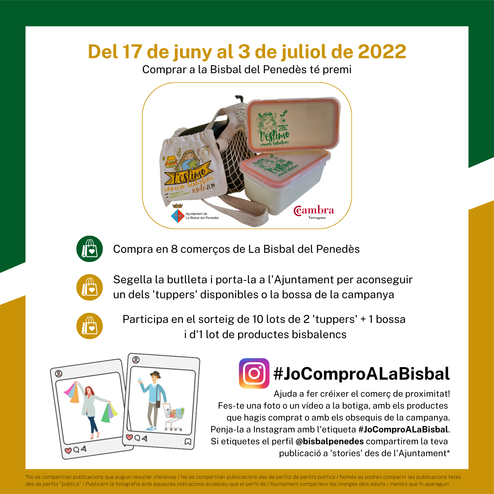 Una vez más, la campaña de dinamización comercial se vehiculará a través de la etiqueta #JoComproAlaBisbal. Los comercios la utilizarán para publicar sus promociones y los clientes podrán colgar sus fotos, con los obsequios de la campaña o comprando en los comercios, utilizando esta etiqueta en Instagram. Si los usuarios lo desean, también podrán etiquetar el perfil @bisbalpenedes en las stories o en las publicaciones de Instagram para que el Ayuntamiento las pueda compartir en las stories del perfil institucional (siempre que los perfiles que hagan la compartición sean públicos).