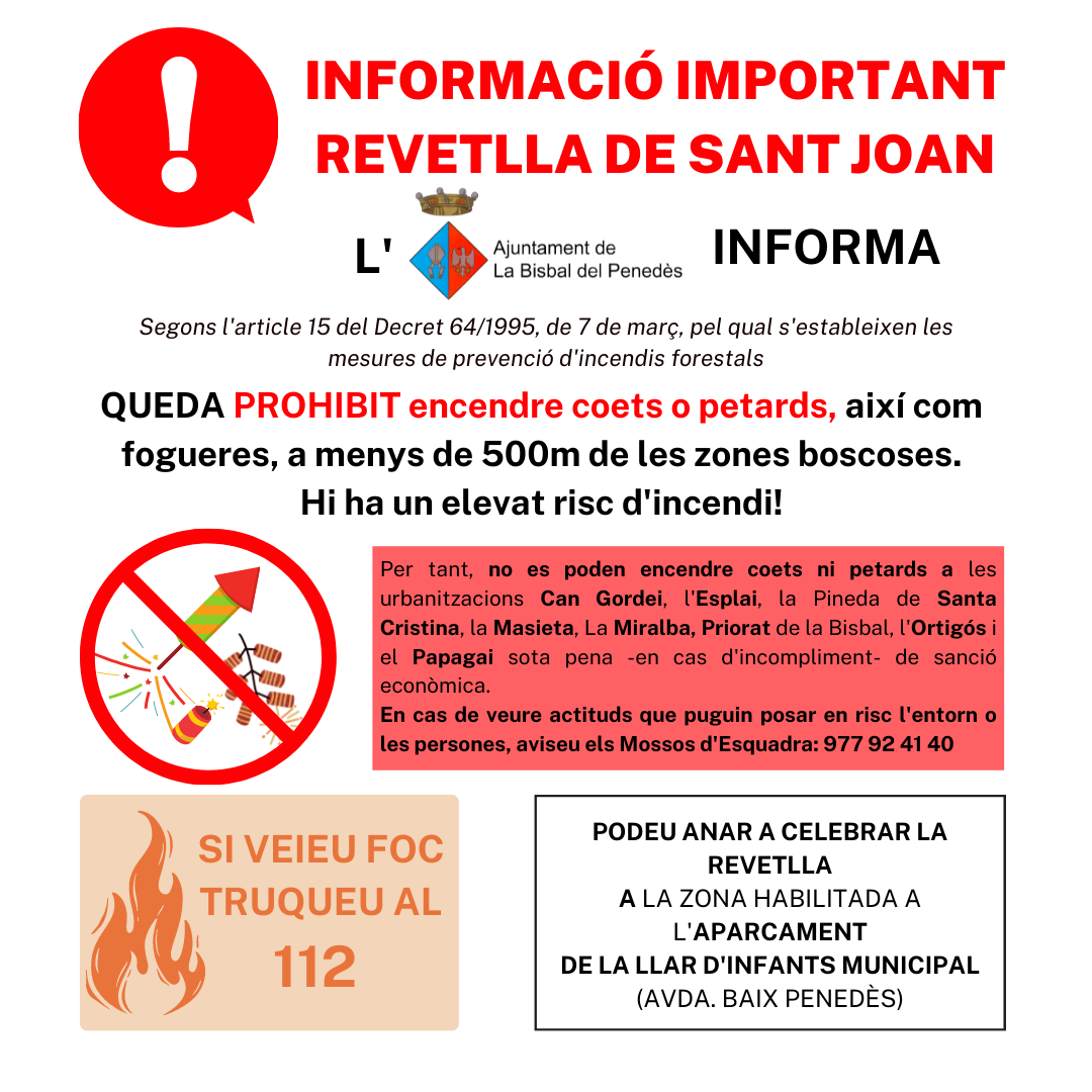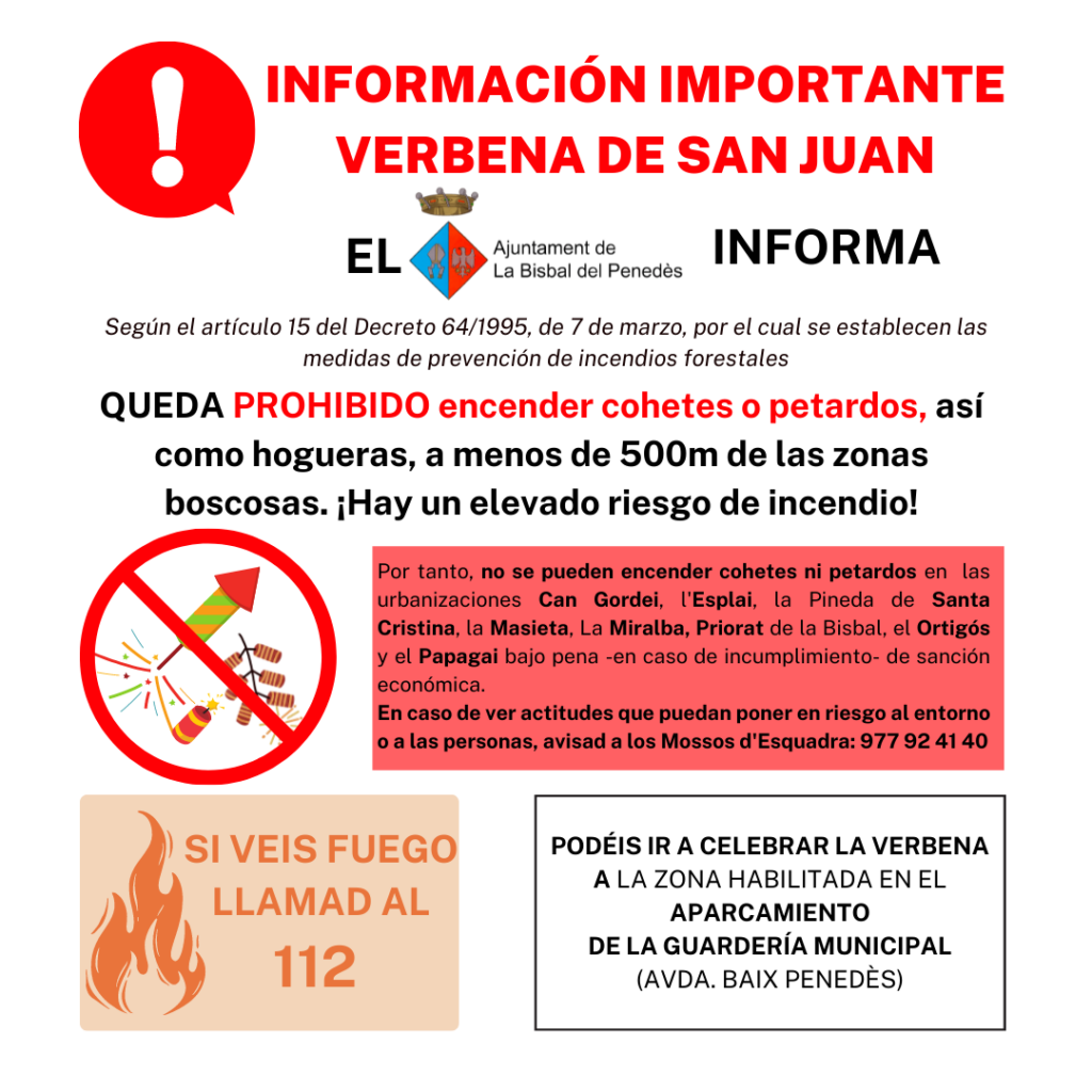 No està permès encendre coets o petards a menys de 500m de les zones boscoses – Si viviu en una urbanització podeu celebrar un Sant Joan segur a l’aparcament de la Llar d’infants