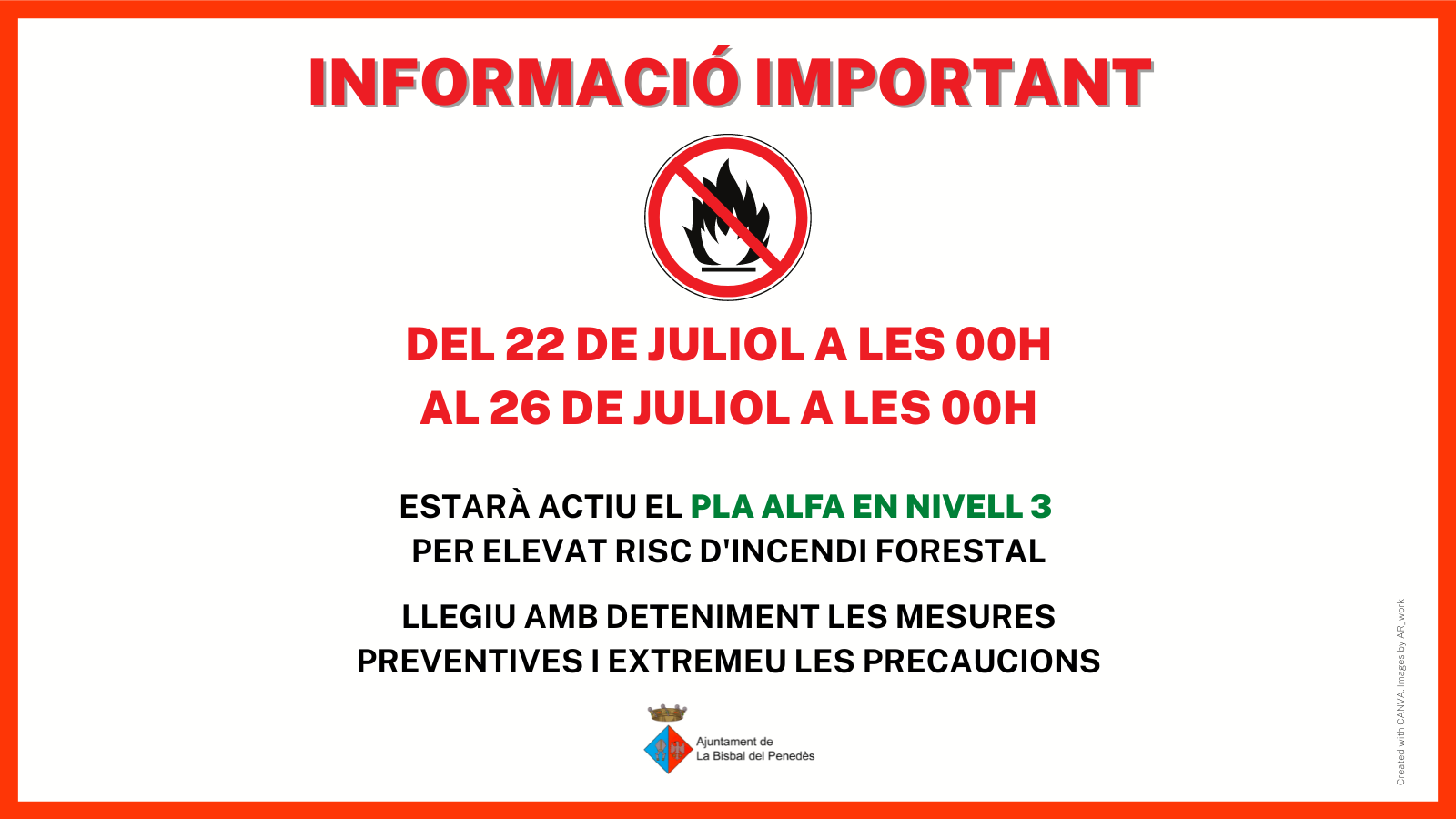 Per aquest motiu, des de les 00.00h d’aquest divendres 22 de juliol i fins al dimarts dia 26 de juliol, s’hauran de complir diverses mesures preventives que ajudaran a evitar els efectes de l’alt risc d’incendi forestal: