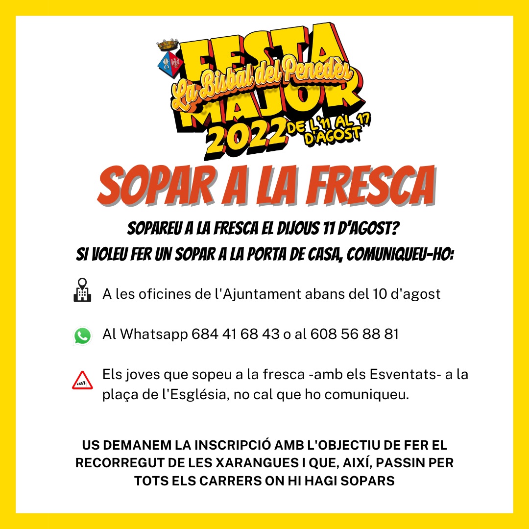 Inscripcions per al sopar a la fresca de la Festa Major – Dijous 11 d’agost