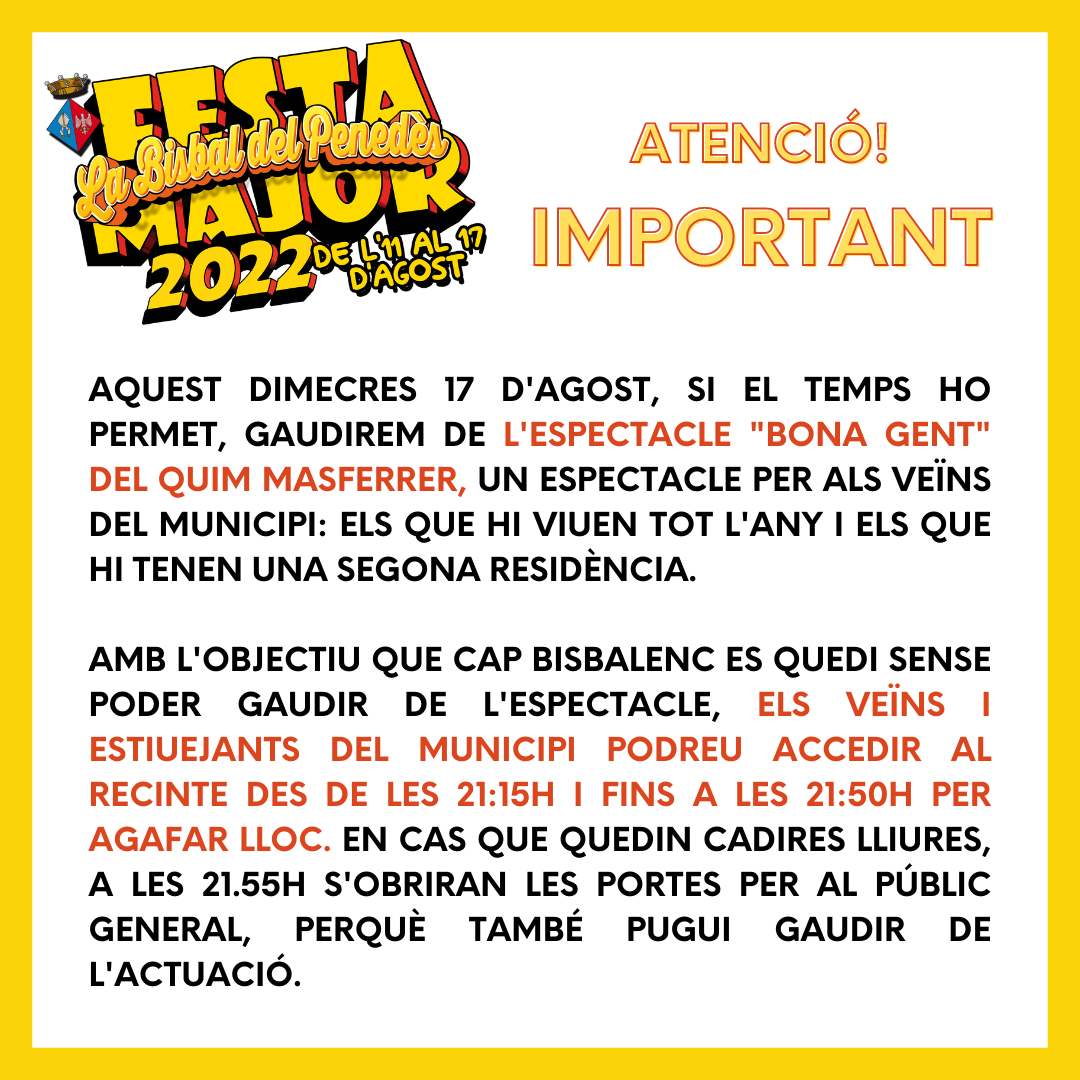 Prioritat d’accés a l’espectacle “Bona Gent” de Quim Masferrer per als veïns del municipi: els que hi viuen tot l’any i els que hi tenen una segona residència.