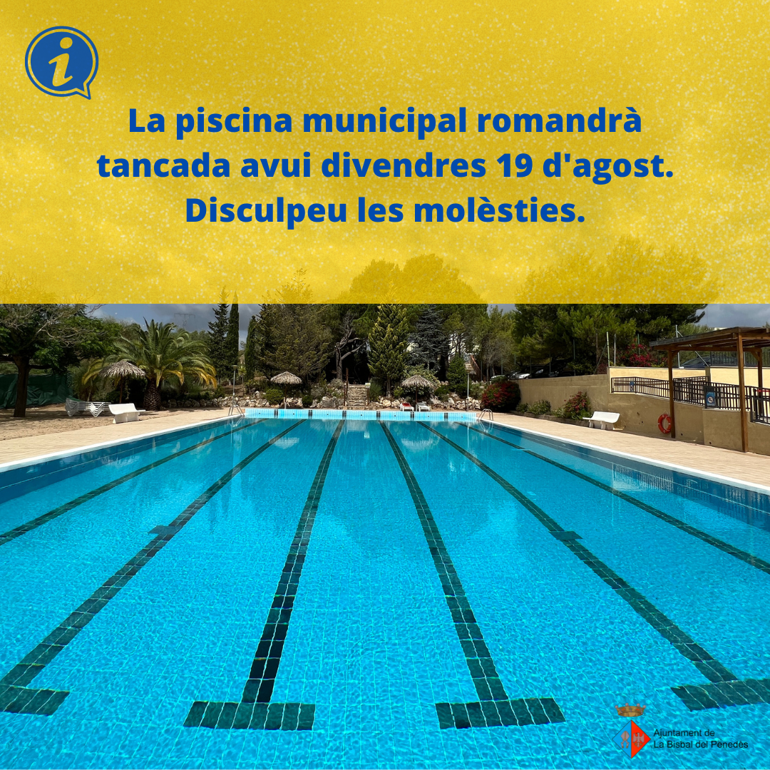 La piscina municipal estará cerrada hoy viernes 19 de agosto. Disculpad las molestias.