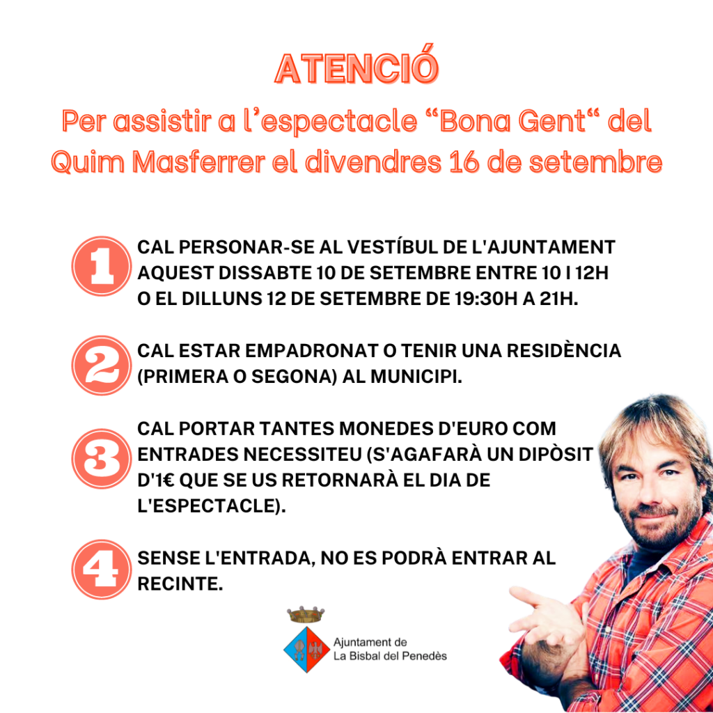 Important: és imprescindible fer reserva prèvia per a l’espectacle “Bona Gent”. Les entrades s’hauran de recollir en els dies i hores que s’indiquen al cartell adjunt i s’haurà de deixar un dipòsit d’1€ que serà retornat el dia de l’espectacle.