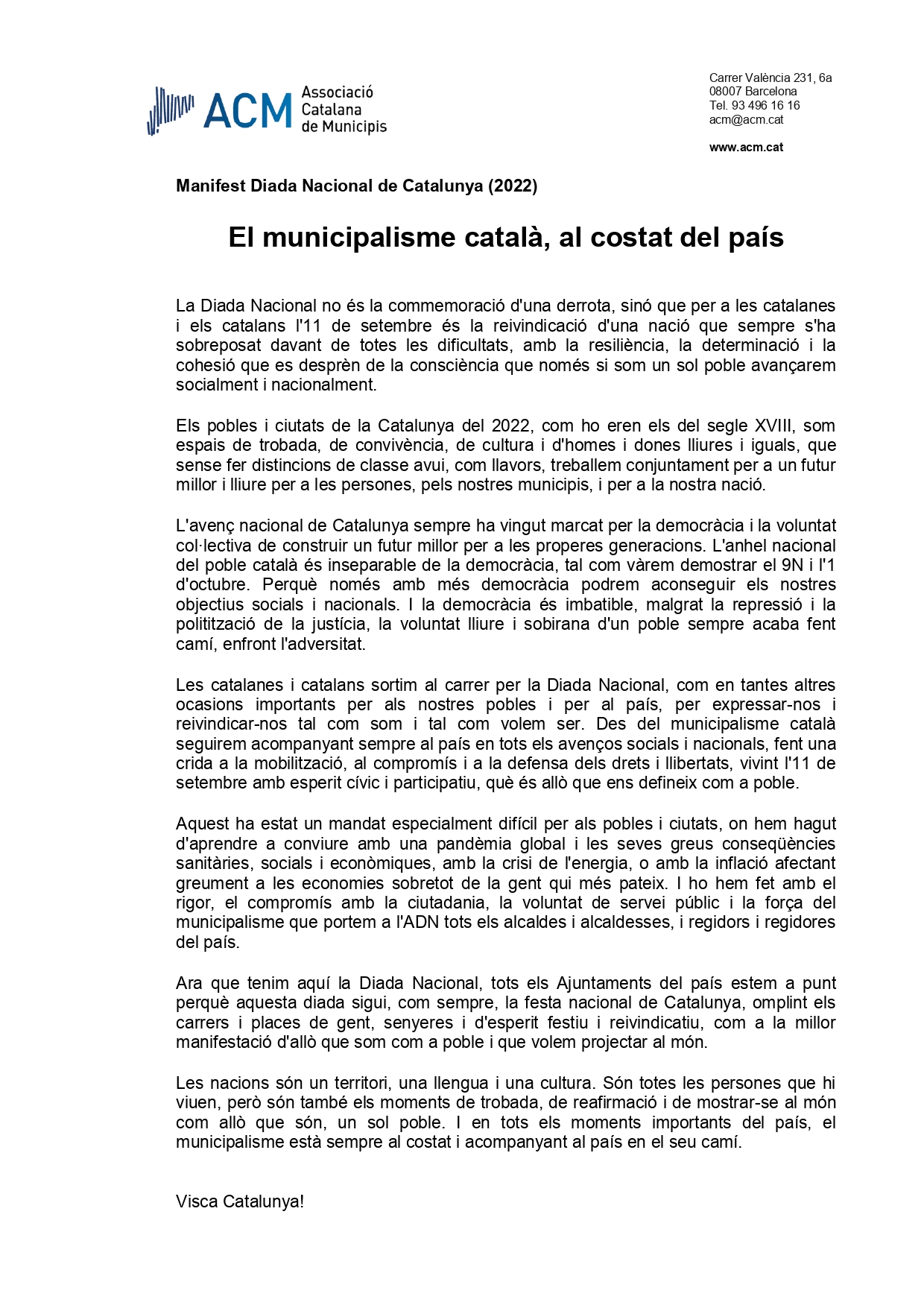 Des de l’Ajuntament de la Bisbal del Penedès ens adherim al manifest de l’Associació Catalana de Municipis amb motiu de la Diada Nacional de Catalunya.